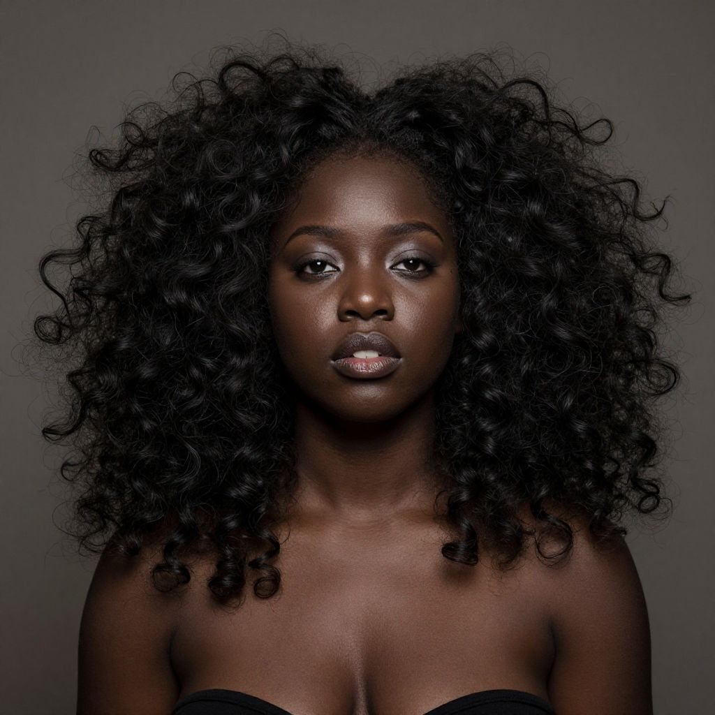 Photograph of a beautiful, dark-skinned Black woman with long black hair, wearing gold chandelier earrings and a gold choker necklace, with a