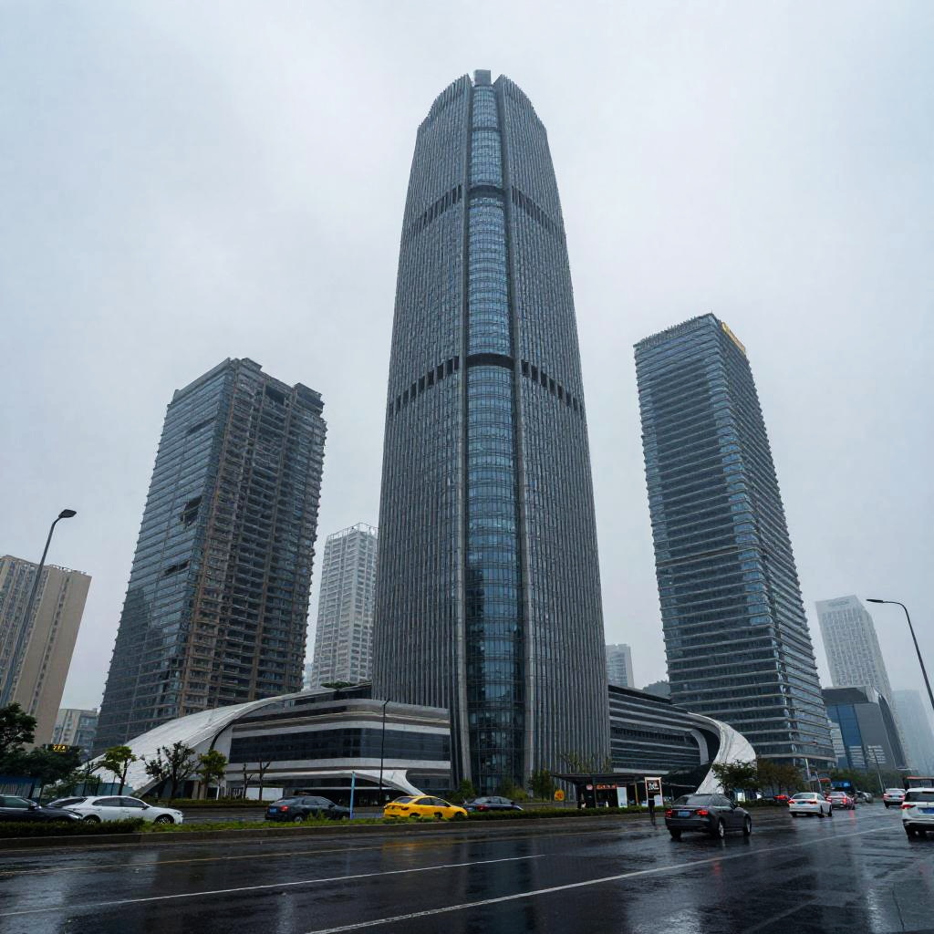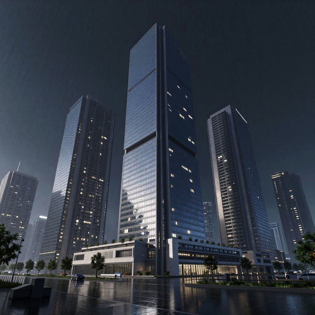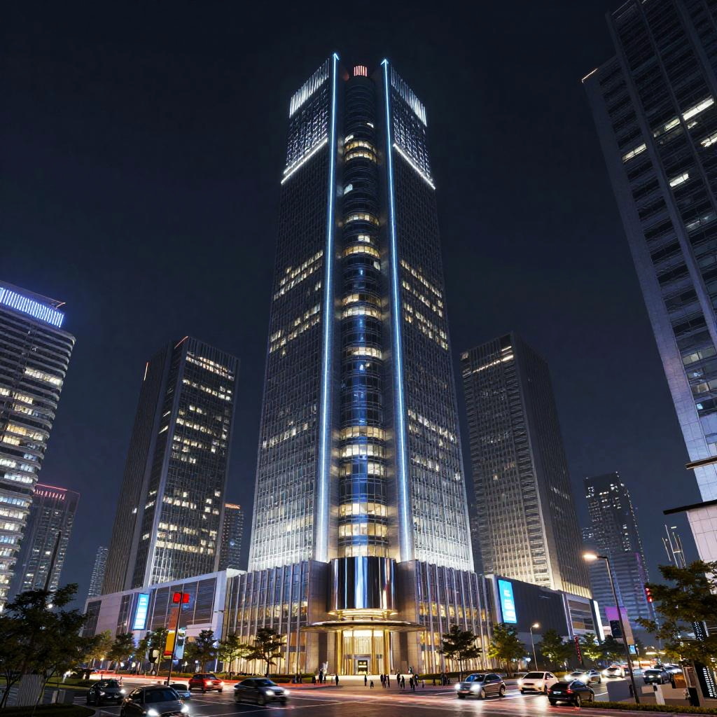 ((Best quality)), ((masterpiece)), ((realistic)), portray a towering highrise office building in a futuristic cityscape. Capture the bustling atmosphere and vibrant neon lighting. The modern and sleek architectural style should be emphasized, showcasing the building's grandeur. Use a digital rendering medium to create a photorealistic concept art. Employ cool tones like blue and silver to evoke a futuristic ambiance. Utilize CGI and ray tracing techniques for high-definition details