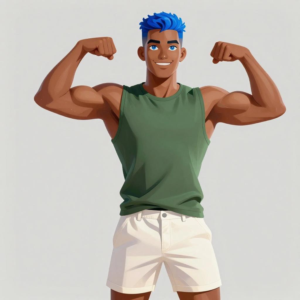 Digital illustration of a muscular athletic man with dark chocolate skin, bright blue buzz cut hair, and blue eyes. He is wearing a green sleeveless shirt and white casual shorts. The man is confidently flexing his arm muscles, stretching his shirt, with a light grey background emphasizing a relaxed summer vibe.