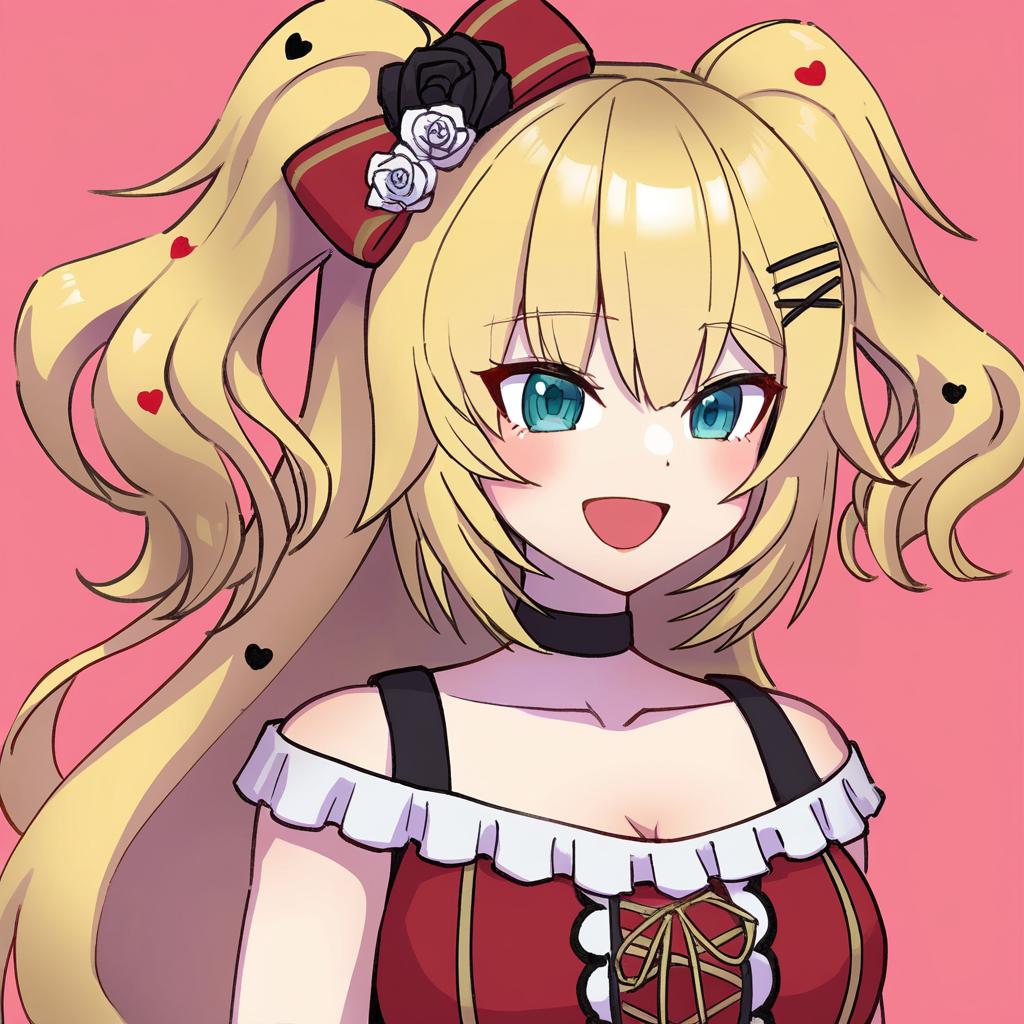 Digital illustration of a blonde anime girl with twin tails hairstyle adorned with heart and rose hair ornaments. She has blue aqua eyes, fair skin, and wears a red dress with white frills and black shoulder straps. The character has a choker and several hairclips on a pink background, drawn in a gothic lolita style typical of virtual YouTubers.