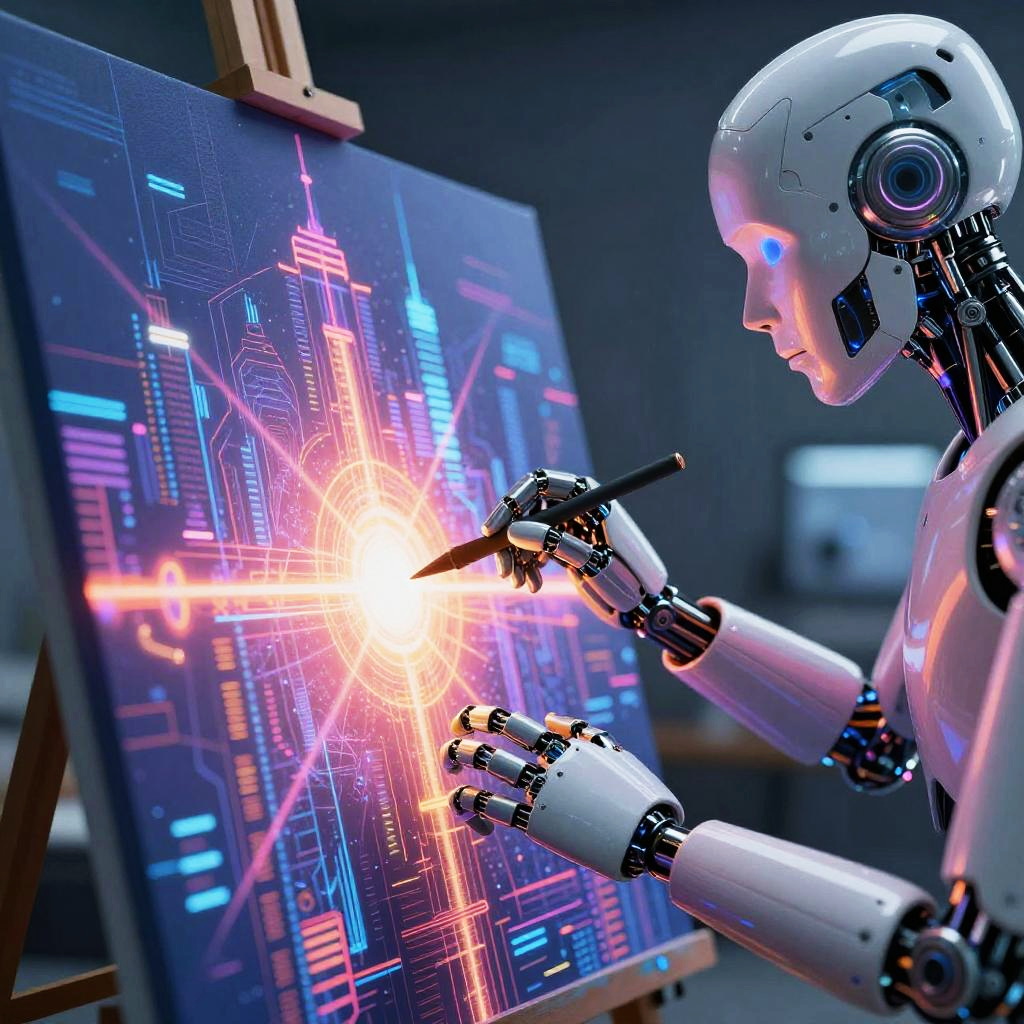 Make ai image of a cybernetic artist with robotic hands painting a luminous, futuristic vision of an urban landscape on a digital canvas, under vibrant neon lights, blending artistic expression and artificial intelligence innovation