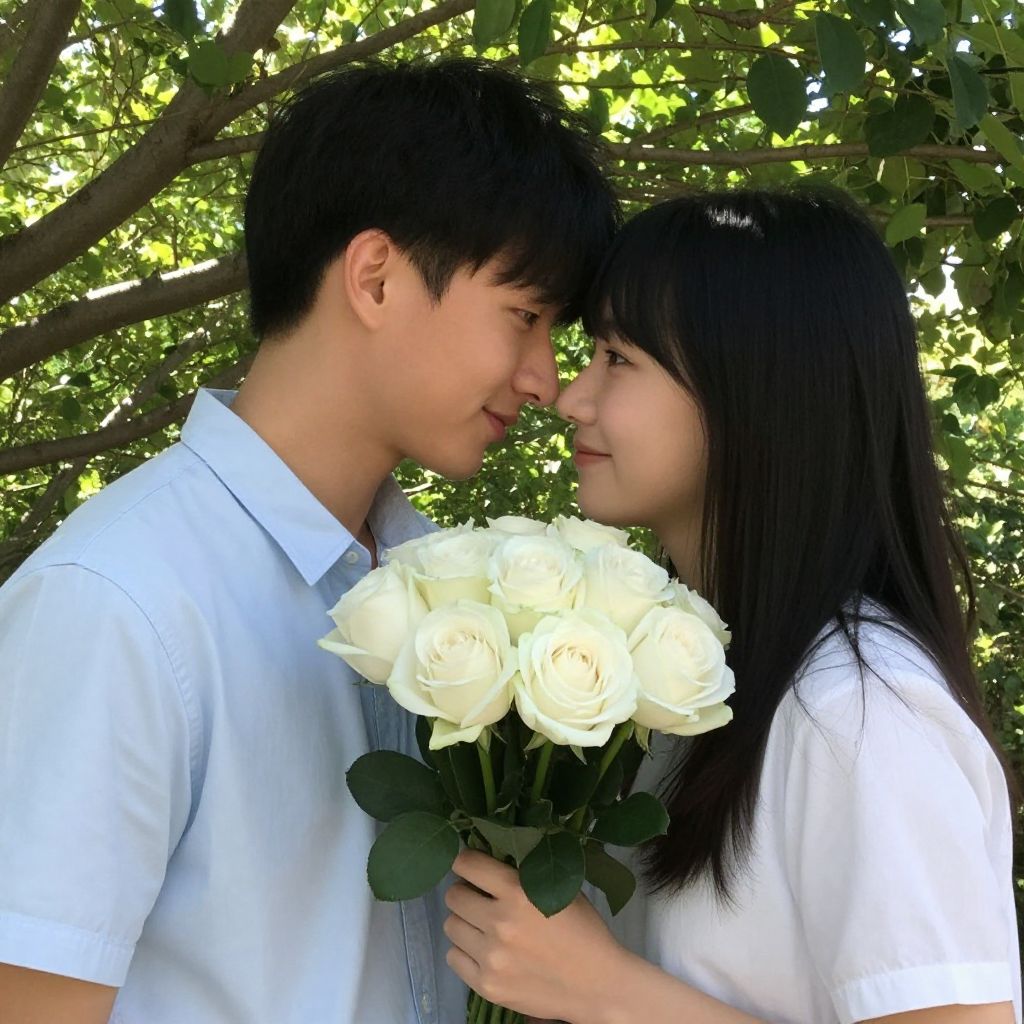Man and woman share an intimate moment outdoors, their faces close as they hold a bouquet of pristine white roses, framed by lush green foliage and soft sunlight filtering through the branches above.