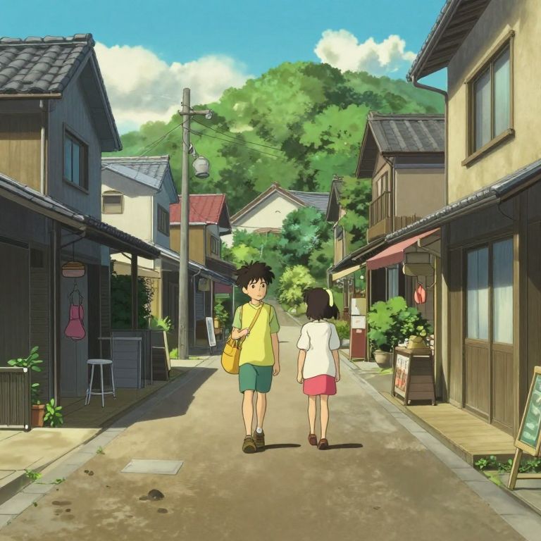 Beautiful slice of life anime scene of rural shopping district street, relaxing, calm, cozy, peaceful, by mamoru hosoda, hayao miyazaki, makoto shinkai