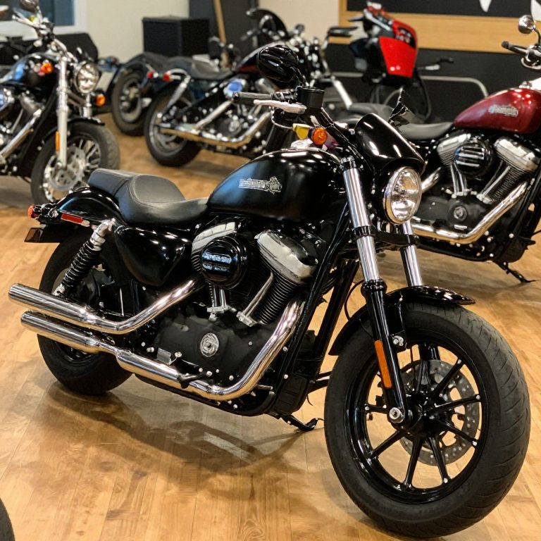 Shiny black 2019 Harley-Davidson Forty-Eight® motorcycle prominently displayed in a showroom, featuring polished chrome accents, a sleek fuel tank, and a classic cruiser design, positioned alongside other motorcycles on a wooden floor.