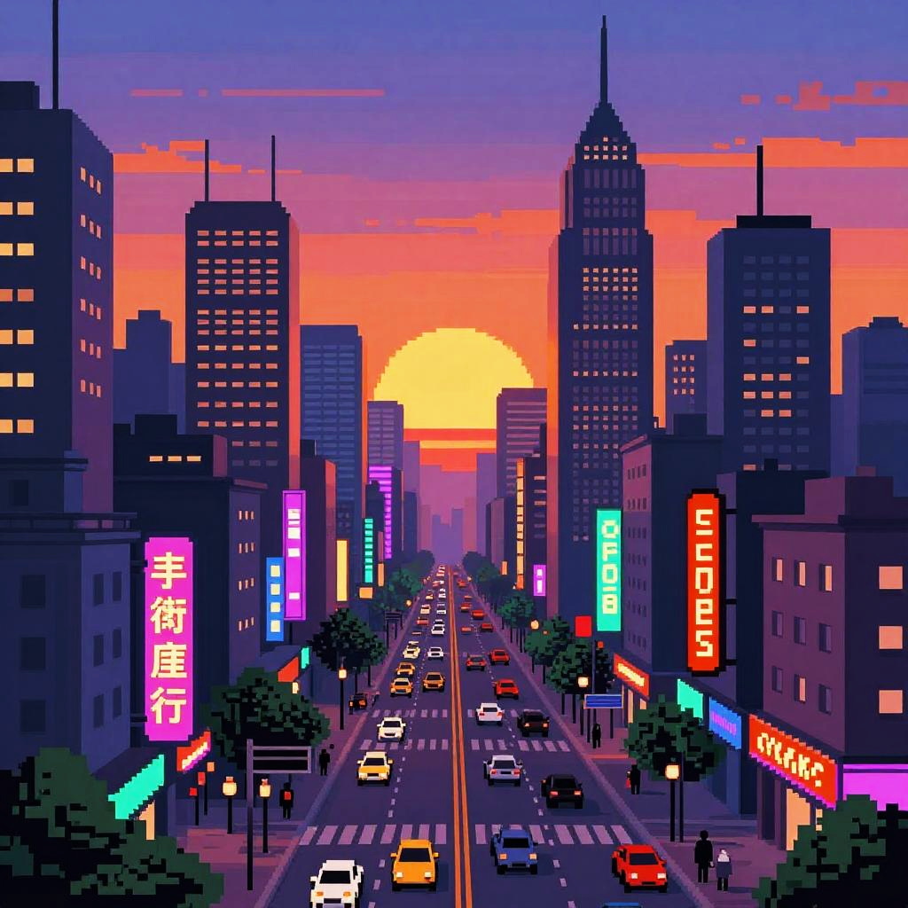 Pixelgrafik art of a vibrant cityscape at sunset, with glowing neon signs and bustling streets, rendered in detailed pixel style with bright contrasting colors and sharp edges, evoking a retro-futuristic atmosphere.