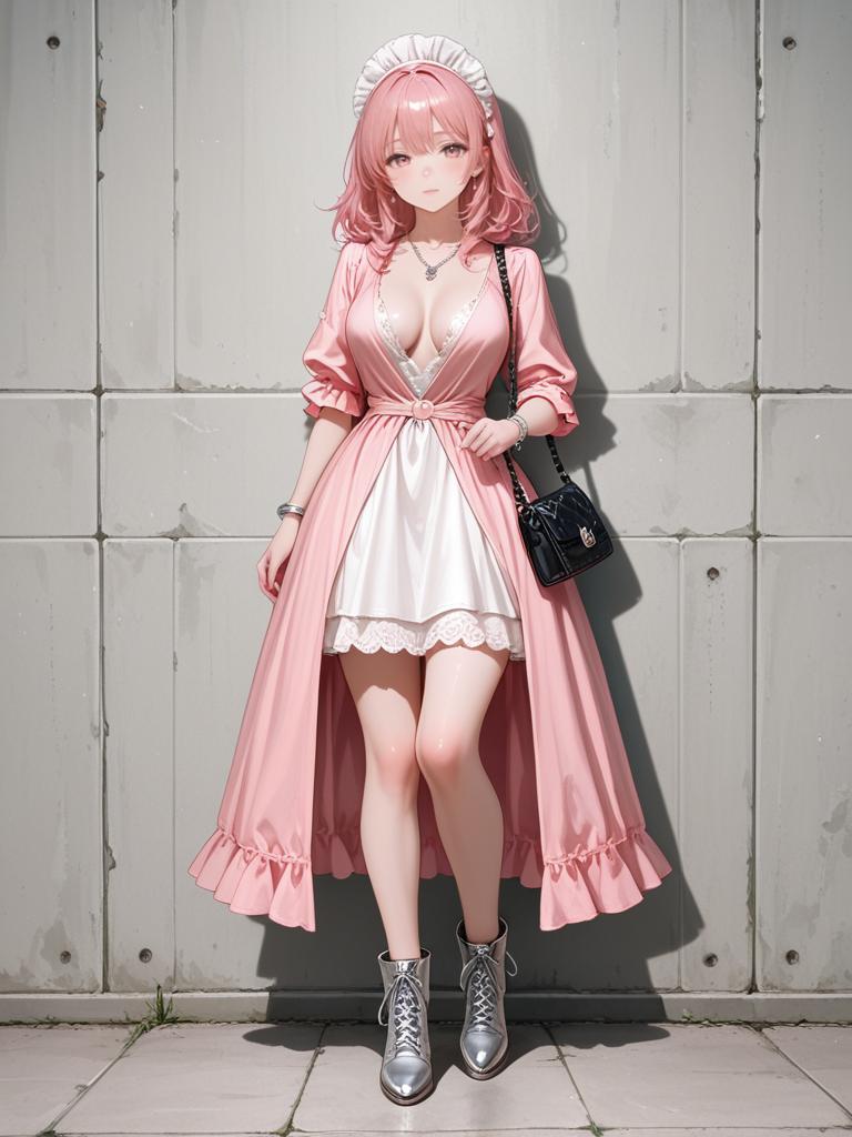 1girl, realistic face, Lace-Up Designs High-Low Dress, soft satin material, blush pink, plunging neckline, crisscross lace-up front, layered ruffles, complemented by silver ankle boots, minimalist silver bracelet, chic crossbody bag.