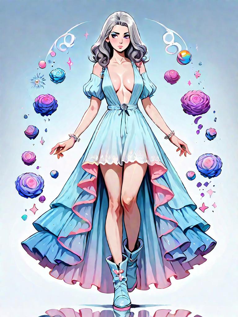 Digital artwork of a young woman with silver hair wearing a lace-up high-low satin dress in blush pink and blue hues. The dress features a plunging neckline, puffed sleeves, and layered ruffles. She accessorizes with silver ankle boots and minimalist silver bracelets, surrounded by floating colorful floral elements on a soft blue background.