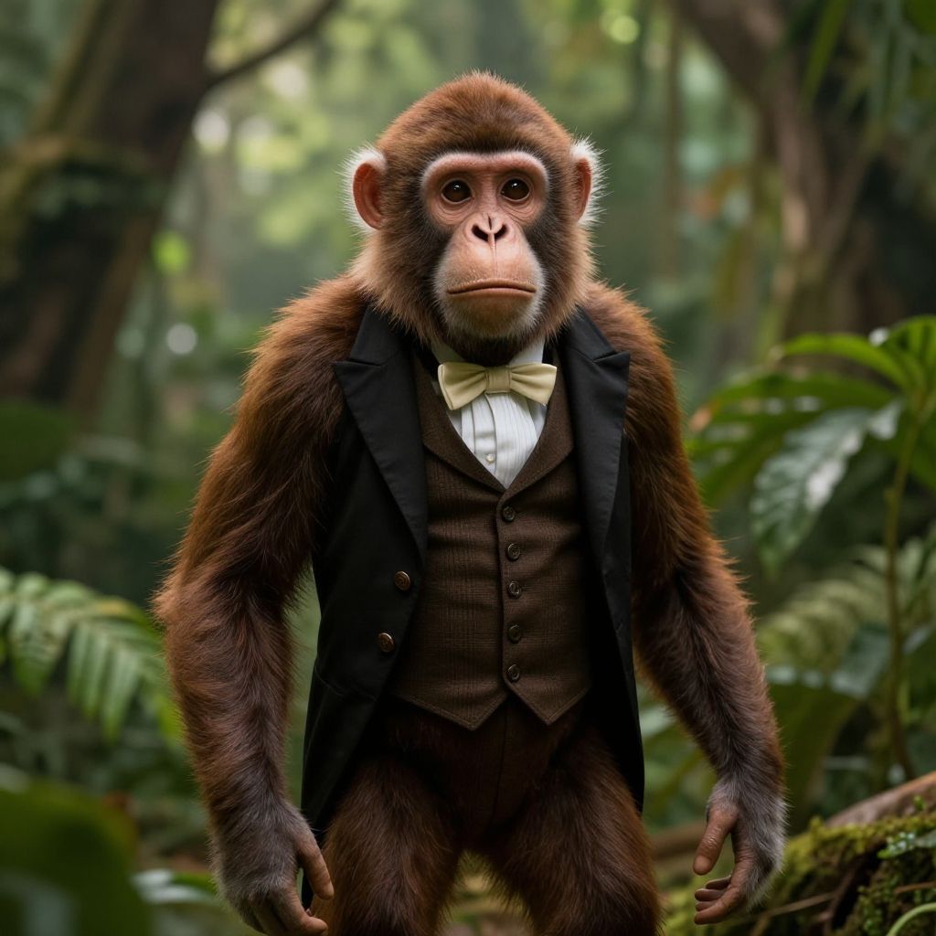 Anthropomorphic monkey dressed as a Victorian gentleman, standing in a lush jungle, detailed fur texture, soft sunlight filtering through trees, highly realistic style.