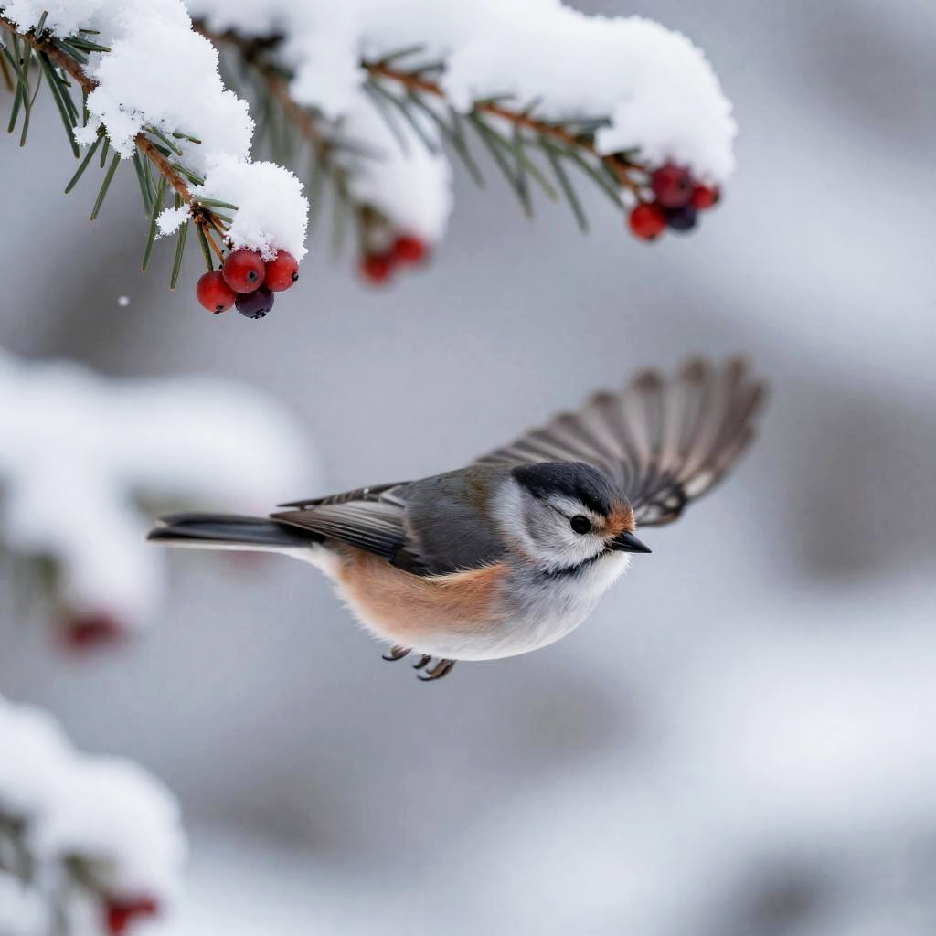 Wide shot, animal focus, bird, flying, in tree, branch, snow, snowflakes, snowy outdoors, winter, blurry background, depth of field, realistic, black eyes, beak, soft lavender-gray, cloudberry, pine tree