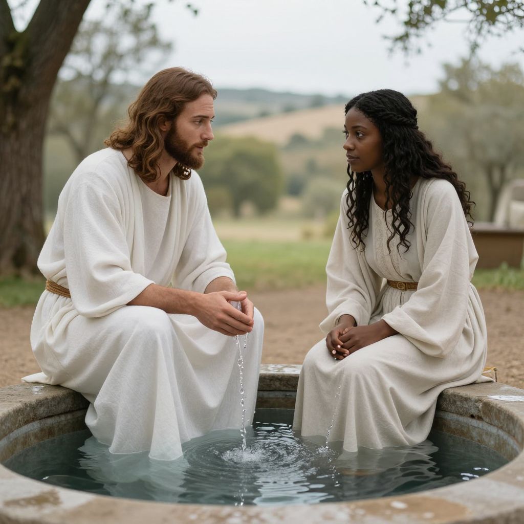 Serenity and transcendence intertwine as Jesus and the Samaritan woman sit by Jacob's Well, their conversation weaving threads of spiritual insight into the gentle ripple of living waters, where the tangible meets the eternal.