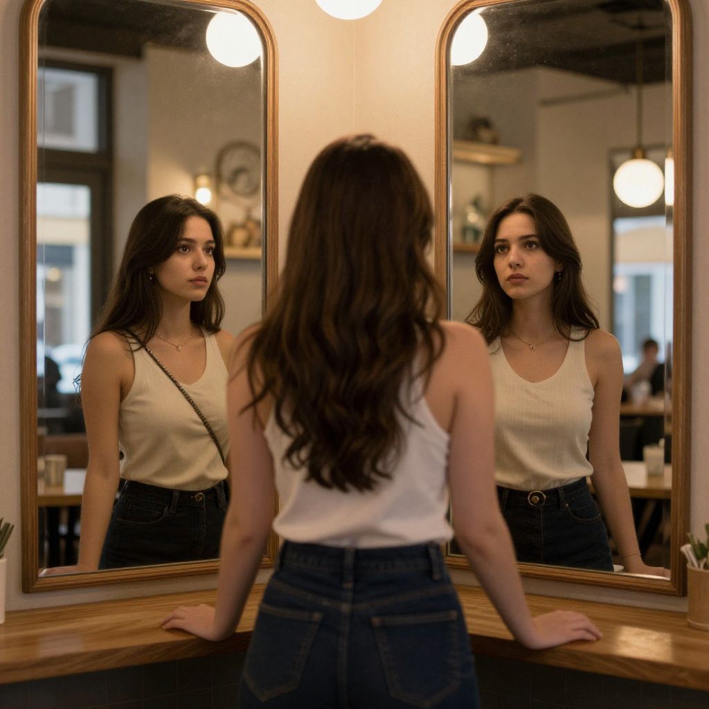 In a warmly lit café, a woman stands between two mirrors, each reflecting a parallel world where her identity seamlessly transforms into another version of herself, blurring the lines between reality and reflection.