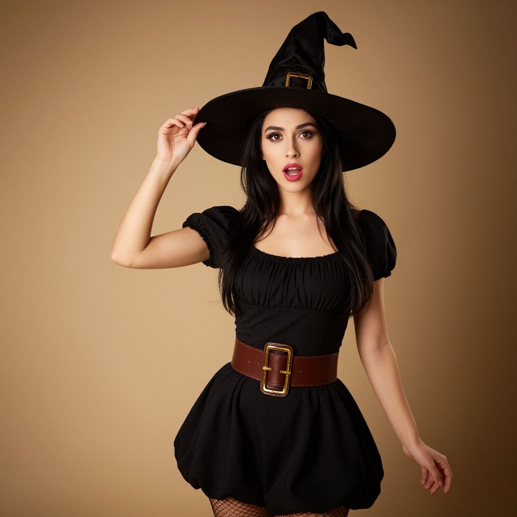 Photograph of a young woman with long black hair, wearing a black witch hat with a wide brim and a buckle, and a black, short-sleeved, pleated dress cinched at the waist with a thick brown belt featuring a large buckle. She has fair skin, red lipstick, and dark, expressive eyes. Her right hand touches the hat's brim, and her left arm is relaxed by her side. The background is a plain, warm beige gradient, highlighting her figure. She exudes a playful, Halloween-themed charm. The lighting is soft, creating gentle shadows.