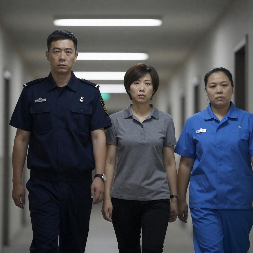 Photograph of three Asian individuals in a dimly lit hallway. A serious-looking man in a dark blue uniform stands on the left, a woman with short brown hair in a gray shirt and black pants is in the center, and a heavier-set woman in a blue uniform stands on the right. Bright fluorescent lights illuminate the background.