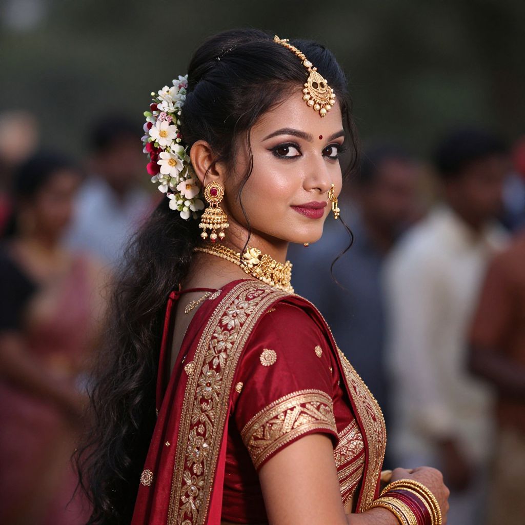 Traditional indian bridal, 1girl, solo, flower, jewelry, hair ornament, earrings, looking at viewer, blurry background, blurry, hair flower, upper body, black hair, from side, long hair