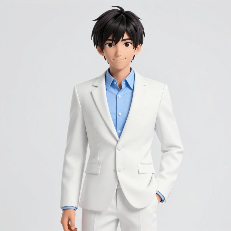The image depicts a highly detailed and realistic CGI illustration of an anime-style character standing against a white backdrop. The character has a friendly, warm smile and is dressed in a white suit with a light blue shirt underneath. The suit is well-fitted, with the jacket slightly open, revealing the shirt's collar. The character's hair is dark and styled in a slightly messy, voluminous manner. The overall composition is balanced, with the character centrally positioned and occupying a significant portion of the frame. The lighting is soft and even, highlighting the character's features and the texture of the suit. The illustration is ultra-detailed, with intricate textures on the suit and subtle shading that adds depth and realism to the character. The character's pose is relaxed and confident, with one hand slightly extended, giving a sense of approachability and friendliness. The image is a perfect blend of anime aesthetics and realistic CGI, creating a visually appealing and engaging scene.