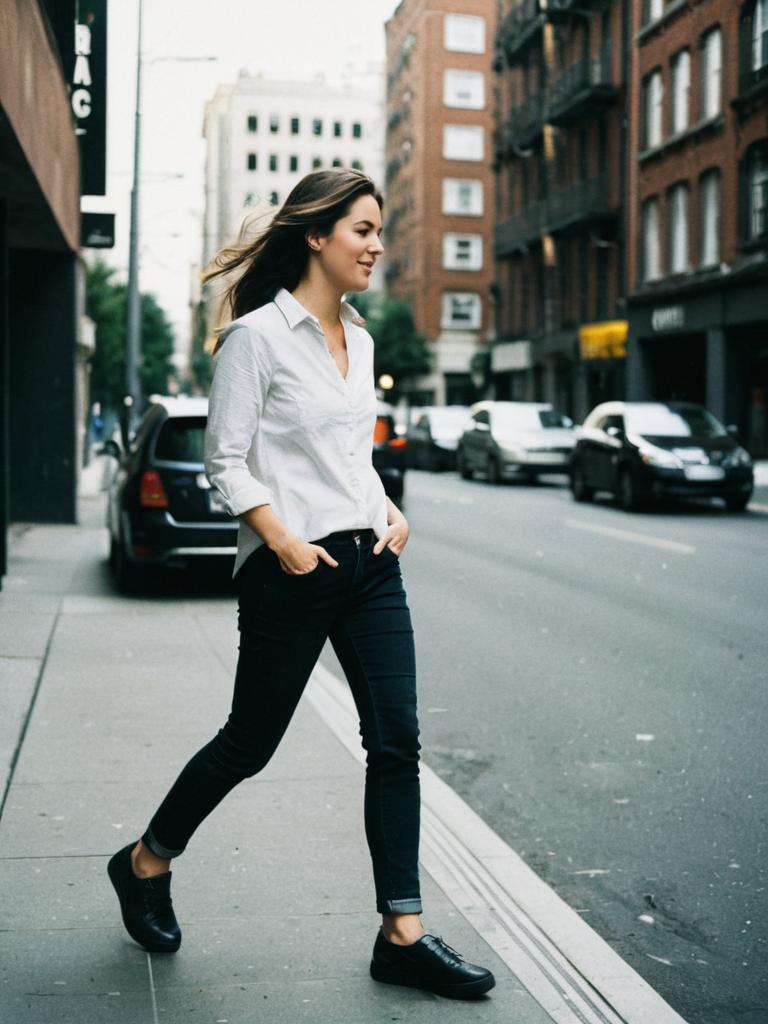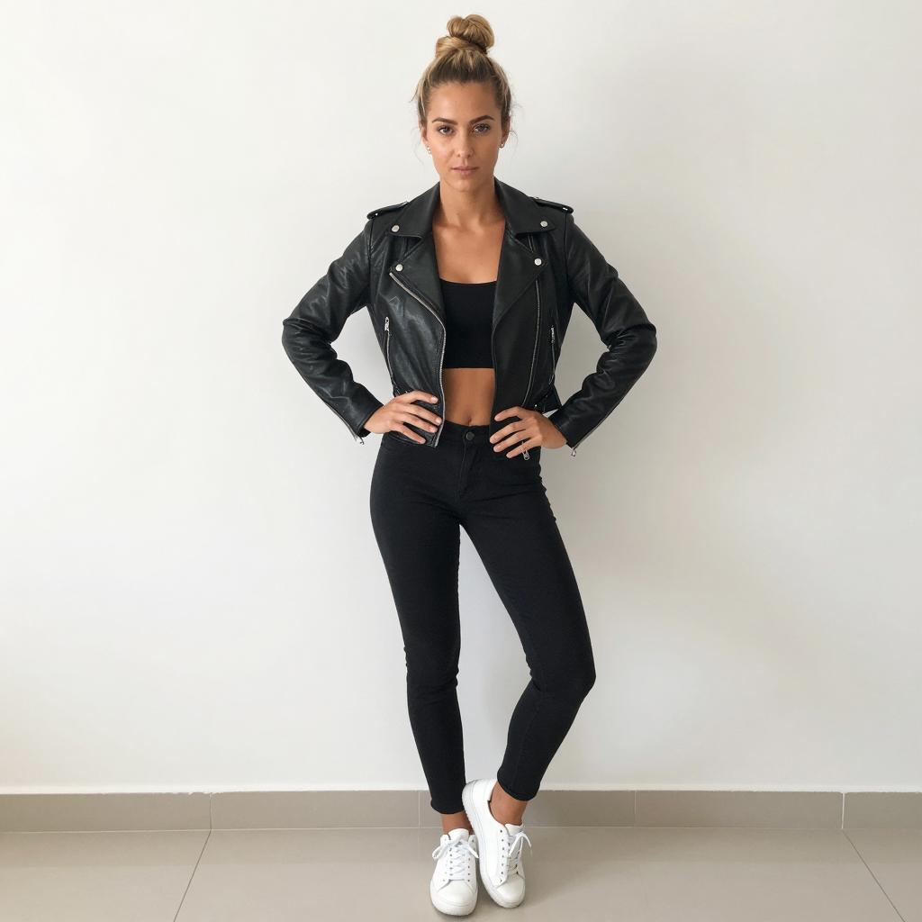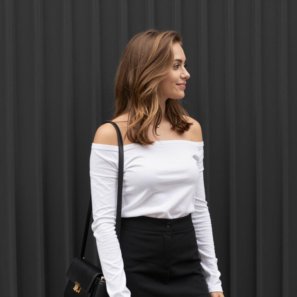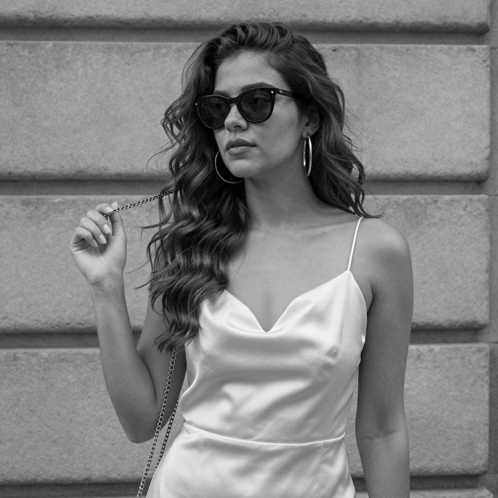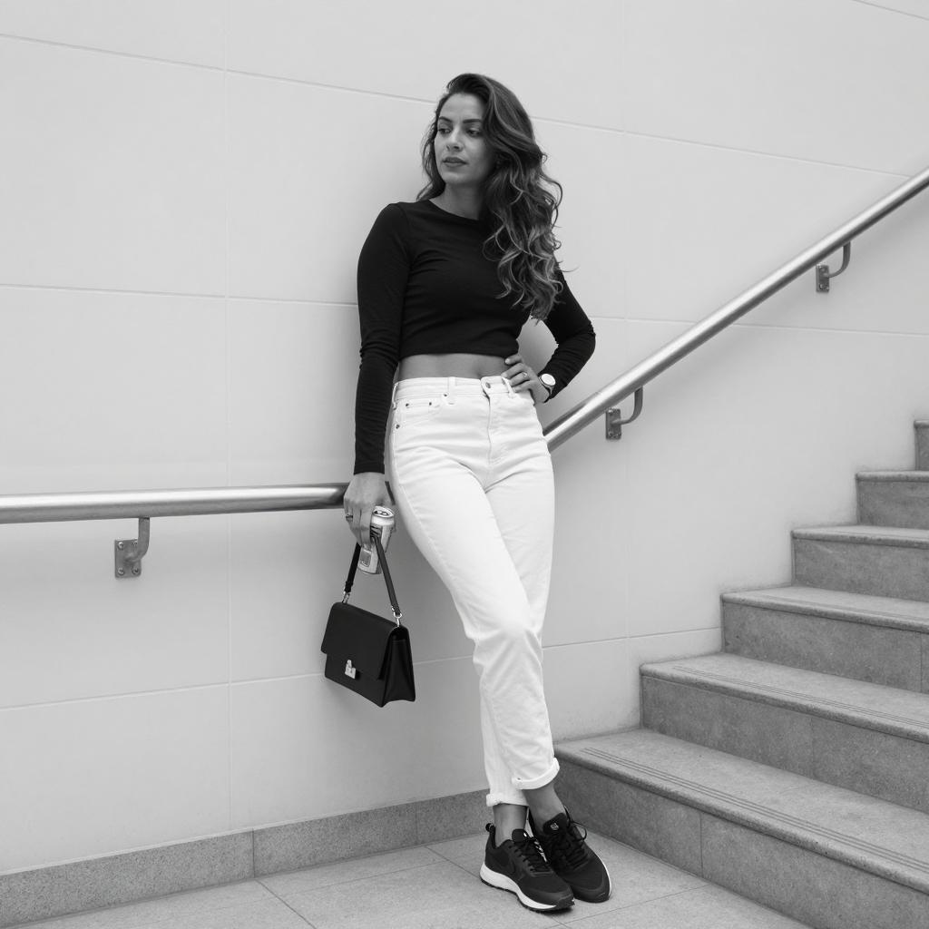 Black and white photo of a woman with long, wavy hair, leaning against a metal handrail. She wears a black long-sleeve crop top, white high-waisted pants, and black sneakers. She holds a can in her right hand and a small black bag in her left. Her right hand rests on her hip. She stands on a tiled floor with stairs to her right. The background is a tiled wall.