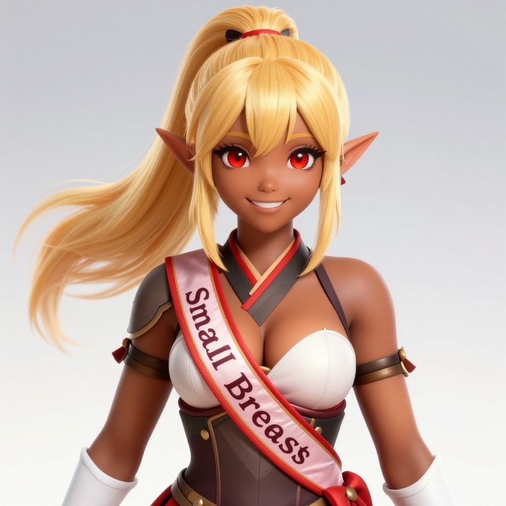 Chloe, 1girl, ponytail, red eyes, kimono, blonde hair, Bra, covered body, Ponytail, hairband, short sleeves, Covered Chest, upper body, sash, 'Small Breasts', fully clothed, clothed, happy smile, brown skin, dark skin, pointy ears, elf ears, ribbon, bangs, bodysuit, pauldrons, armor, white elbow gloves(masterpiece:1.1)intricate eyes, beautiful detailed eyes, symmetrical eyes, (dark-skinned female:1.2), cute, adorable, happy, (centered, scale to fit dimensions, Rule of thirds), (ultra detailed, extremely detailed), (photorealistic artwork:1.37), (extremely detailed CG unity 8k wallpaper), (((vibrant colors, vibrant theme))), (intricate), (masterpiece), (best quality), vanilla