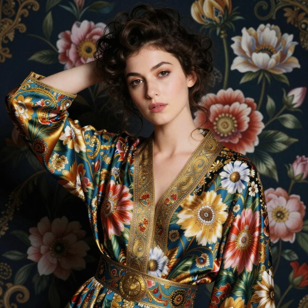 Photograph of a young woman with fair skin and dark, wavy hair styled loosely. She wears a vibrant, long-sleeved robe adorned with intricate floral patterns in yellow, red, and white on a dark blue background, accented with gold embroidery along the V-neck and sleeves. Her right hand is raised, touching her hair, and she gazes directly at the camera with a neutral expression. The backdrop features a dark blue floral wallpaper with large, detailed pink, white, and yellow flowers, creating a rich, contrasting background. The image has a high-contrast, dramatic lighting that highlights the textures and colors of both the robe and the floral background.