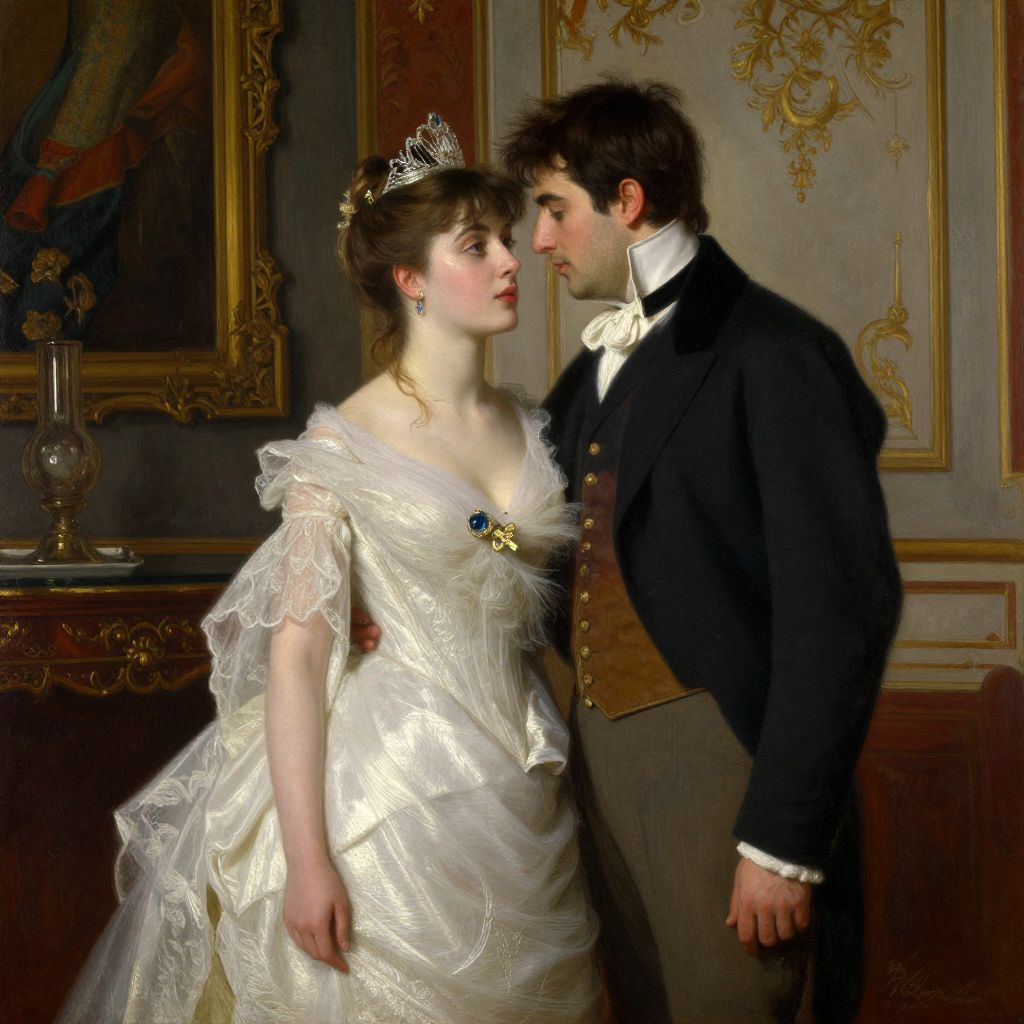 A romantic oil painting by Frederic Soulacroix titled \"A Secret Liaison,\" featuring a couple in elegant attire, with the woman adorned in a white gown and tiara, and the man in a formal suit, set against a richly detailed interior backdrop with dramatic lighting and vintage charm.