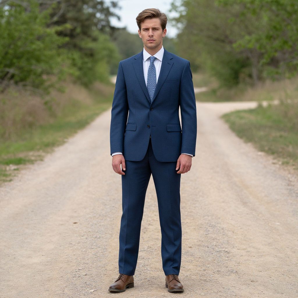 "Country Gentleman Clothing, man in a blue suit and tie standing on a dirt road"