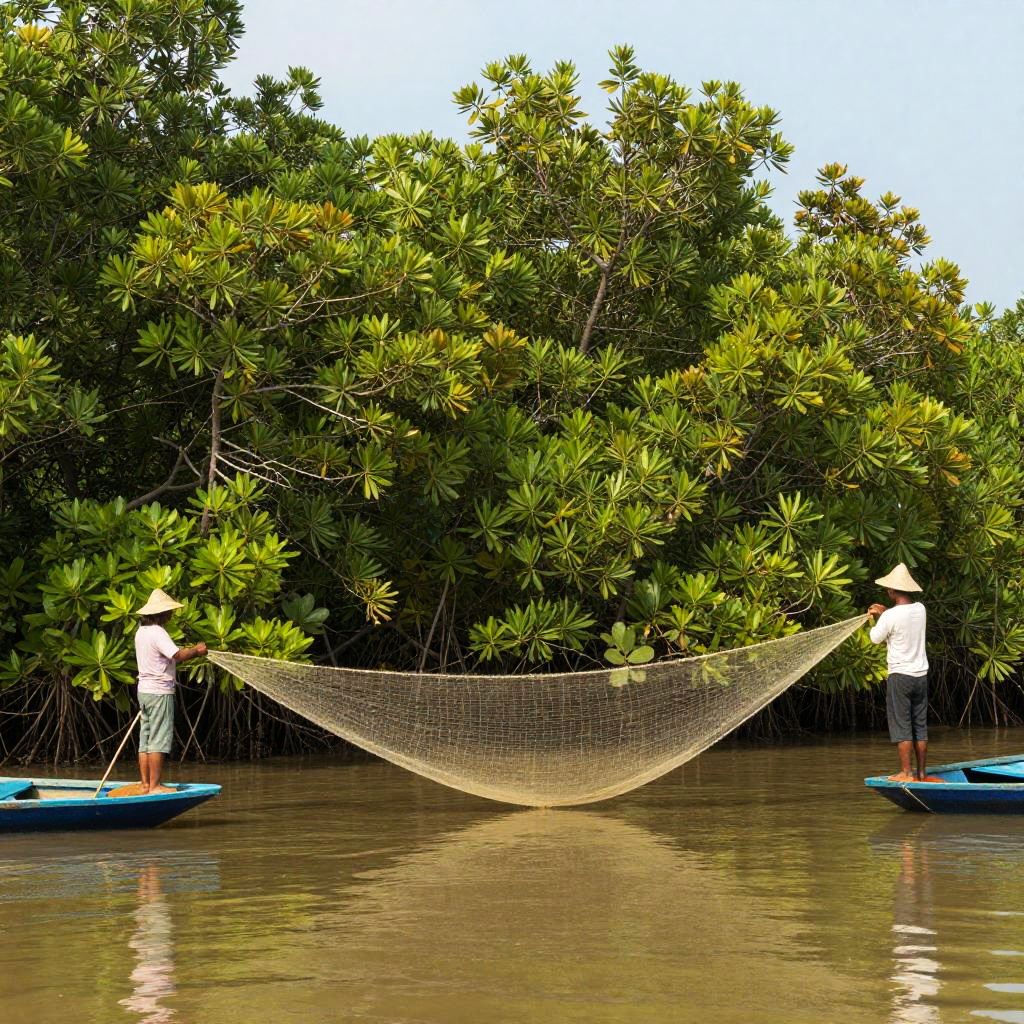 A National Geographic-style photograph of a fertile river delta, featuring fishermen casting nets, dense mangrove trees, on the Mekong Delta region, ultra-high quality and realistic