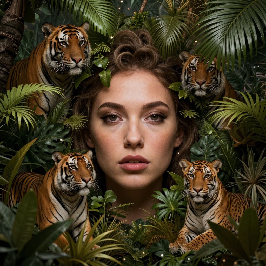 Digital artwork featuring a fair-skinned woman with brown, curly hair, centered in a lush, jungle-like setting. Her expression is neutral, with slightly parted lips and soft, natural makeup. Surrounding her are four realistic, detailed Bengal tigers with orange fur, black stripes, and white underbellies, positioned among dense, green tropical foliage, including palm leaves and vines. The image has a hyper-realistic style, with rich textures and vivid colors, creating an immersive, almost surreal jungle scene. The woman's face is the focal point, framed by the tigers and foliage.