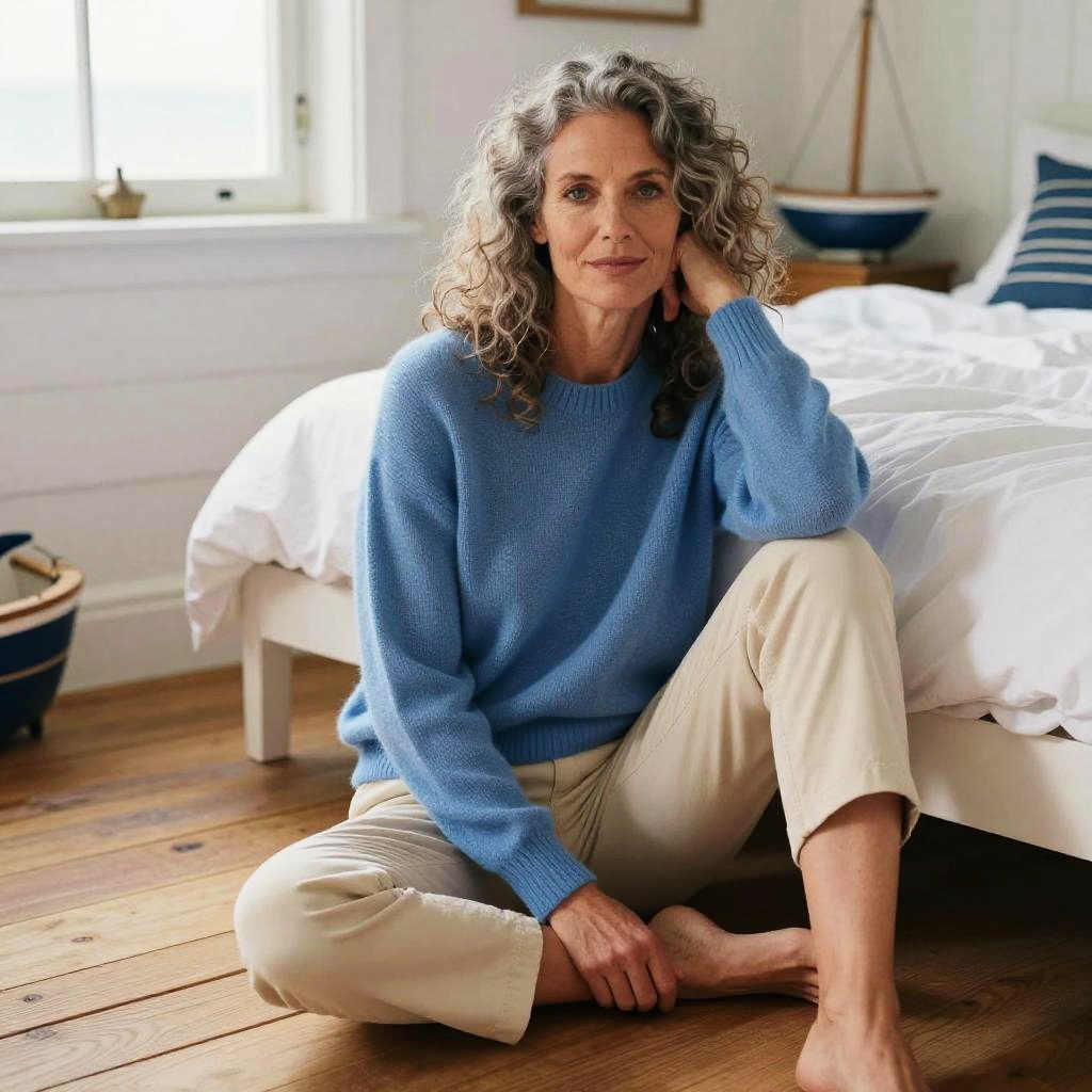 Photograph, young woman with shoulder-length wavy chestnut hair and amber eyes seated on a wooden floor beside an unmade bed, artistic studio bedroom with canvases and paint supplies scattered. Wearing oversized striped sweater and black leggings, direct eye contact and a calm, confident expression. Bright natural window light, soft shadows, shallow depth of field, editorial fashion vibe, subtle film grain, realistic skin tones, high-detail textures, balanced composition, cozy lived-in atmosphere, contemporary magazine aesthetic.