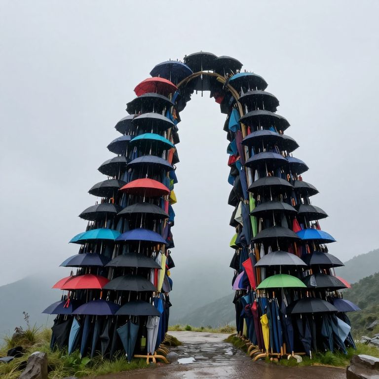 A mountain made entirely of stacked umbrellas opens a skyward portal every monsoon season.