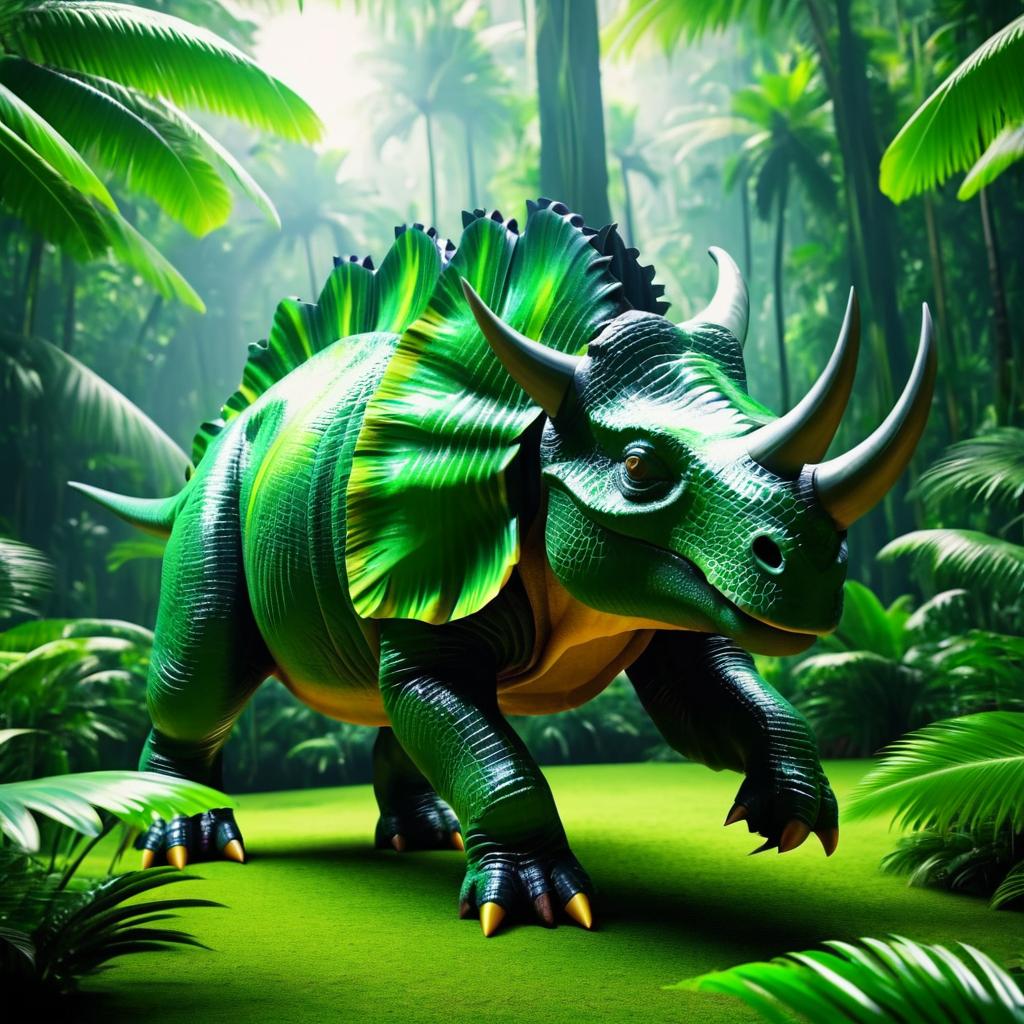 Photorealistic image of dinosaur Triceratops. Dinosaur is robotic form. Set in tropical rainforest, shot on iPhone, UHD, 8k.