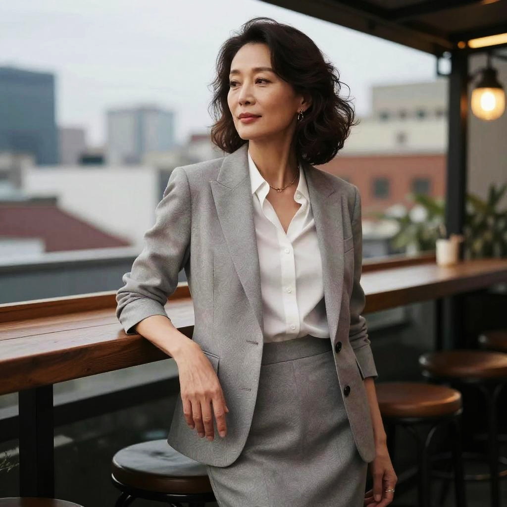 Photograph of an Asian woman with wavy, shoulder-length black hair, standing on a rooftop bar at dusk. She is wearing a tailored, light-gray suit with a white blouse, a gold necklace, and a bracelet. Her right hand rests on a wooden railing, and her left hand is by her side. The background includes blurred city buildings and soft, warm lighting from candle-like lanterns on the bar. She has a confident expression and is looking to her left. The setting is modern and elegant, with a focus on her stylish appearance.