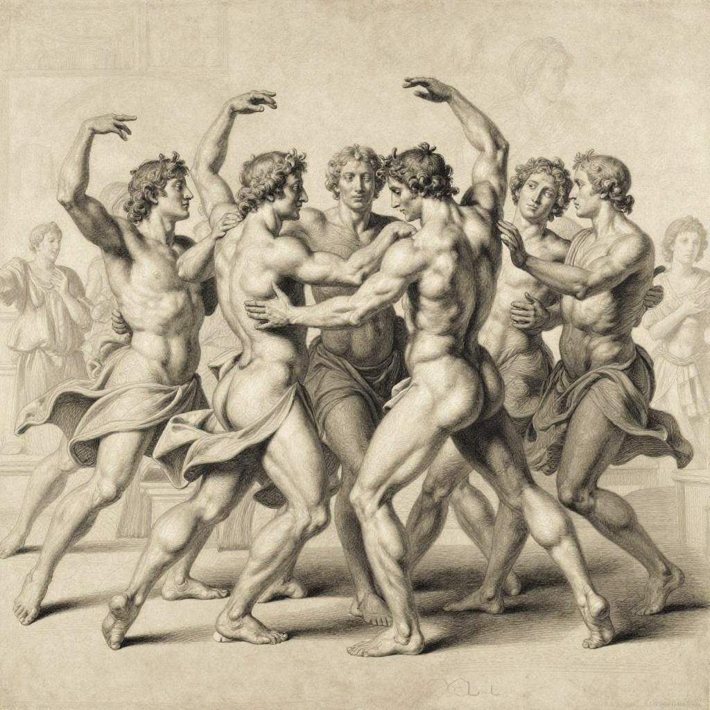 Realistic photo.Classical pencil drawing by Michelangelo Buonarroti depicting a group of dancers, with flowing lines, expressive movements, and harmonious poses, in lively and celebratory, iconic and masterful realistic photo