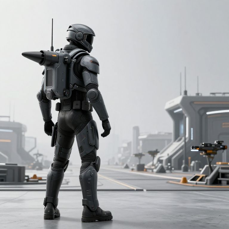 Minimalist Decor professional commercial photo of a futuristic soldier wearing an exoskeleton and jetpack::scene from a modern dramatic sci-fi movie::Photo of a futuristic war zone,
