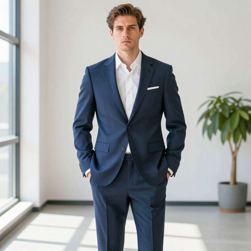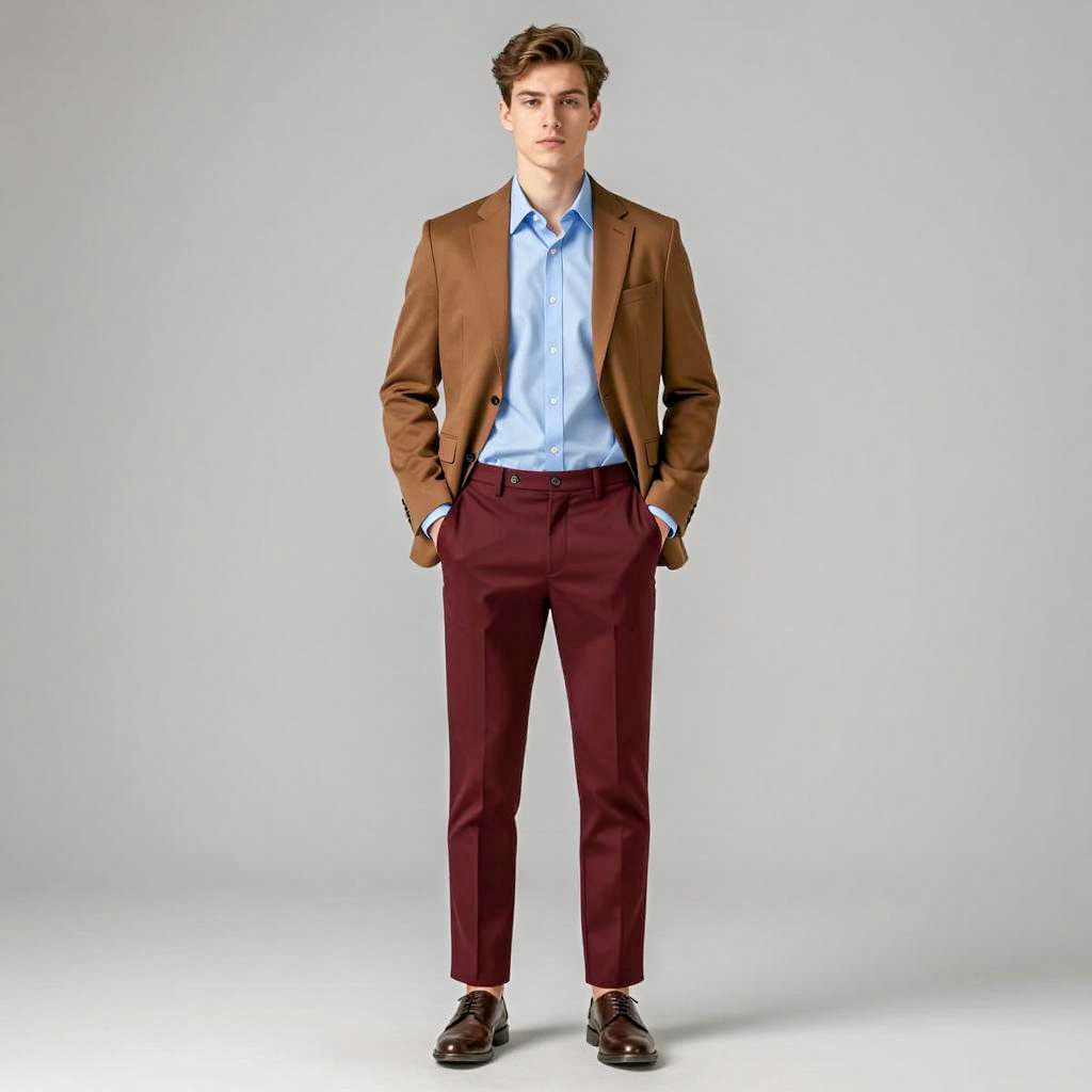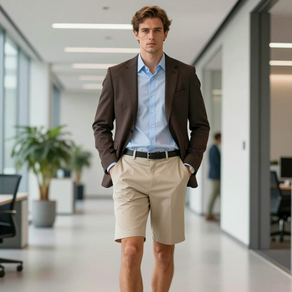 Office work shorts costume, photorealistic, male model, standing in modern office hallway, full body shot, brown hair, light skin, wearing dark brown blazer, light blue dress shirt, beige knee-length shorts, black belt, hands in pockets, serious expression, soft natural light, potted plant in background to the left, blurry figure in background to the right, polished floor, tall ceiling, clean and minimalist, contemporary fashion style, high quality, realistic details