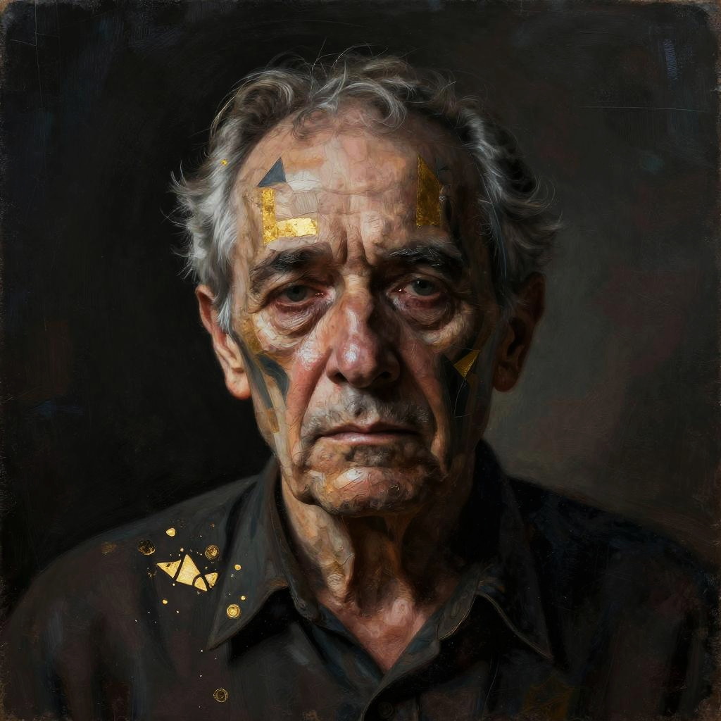 Realistic photo.Surreal, abstract portrait of an elderly man with a focus on despair. The artwork features intricate layers and textures, with elements like geometric shapes interwoven into the subject’s form. The composition is rendered in a dark, moody palette with touches of gold to add contrast and visual depth. Designed with a rough, textured aesthetic that includes dripping, smeared, or fragmented details, creating a haunting and enigmatic atmosphere. Inspired by surrealist and abstract techniques, this piece captures an emotional depth and a sense of mystery, evoking feelings of solitude. realistic photo