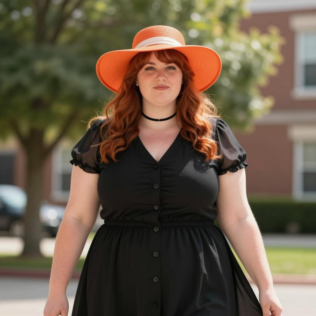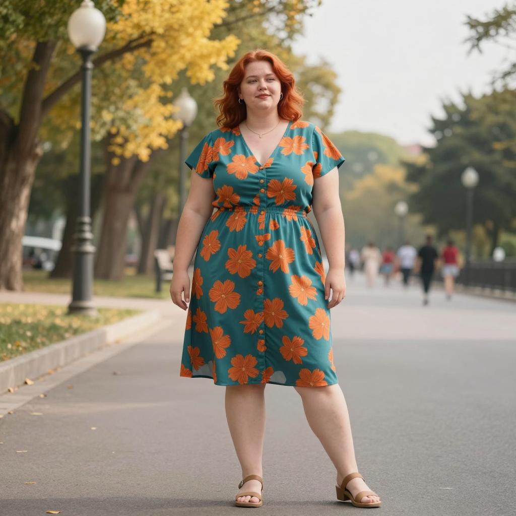 Sock hop cutie plus size, photograph of plus-size woman, standing on a path, daytime, blue polka dot dress with white circles, pink trim, black belt, short sleeves, brown wavy hair, pink bow headband, brown shoes with pink bows, smiling, leafless trees in background, green grass, suburban setting, sunny, full body shot, casual style, retro dress, outdoor, realistic, natural light
