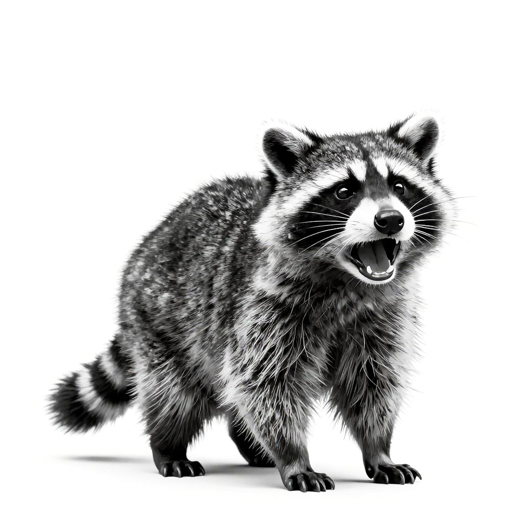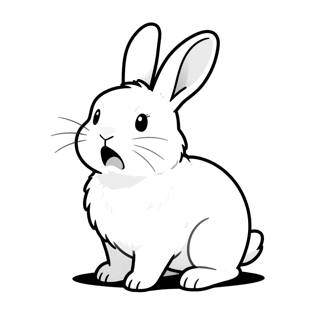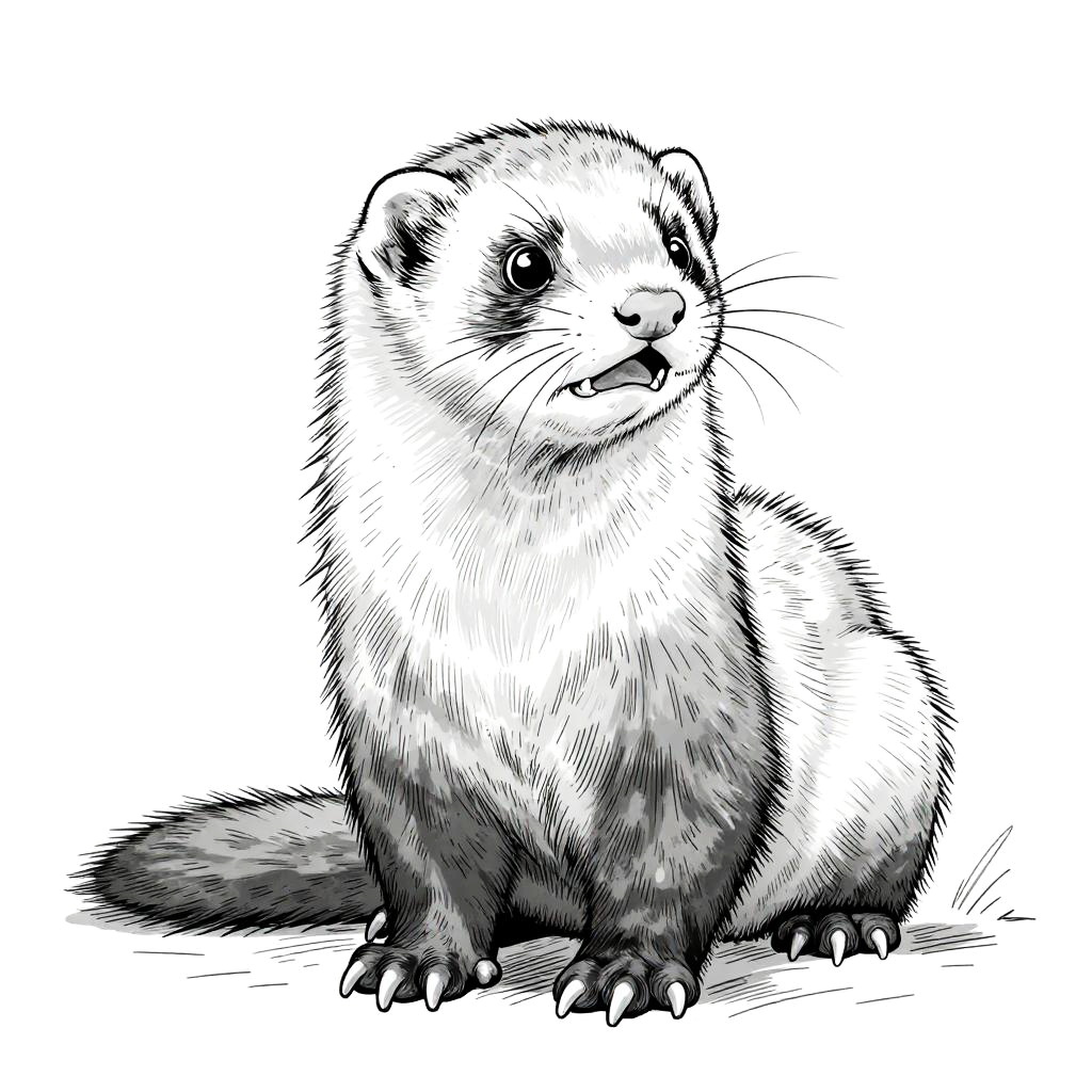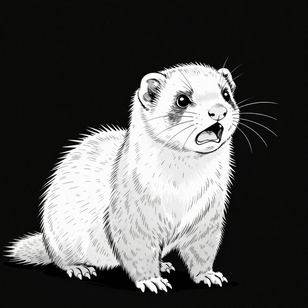 Black and white line art of a cautious white ferret with fur raised, back arched, mouth open, and wide eyes, capturing a sense of fear and tension.