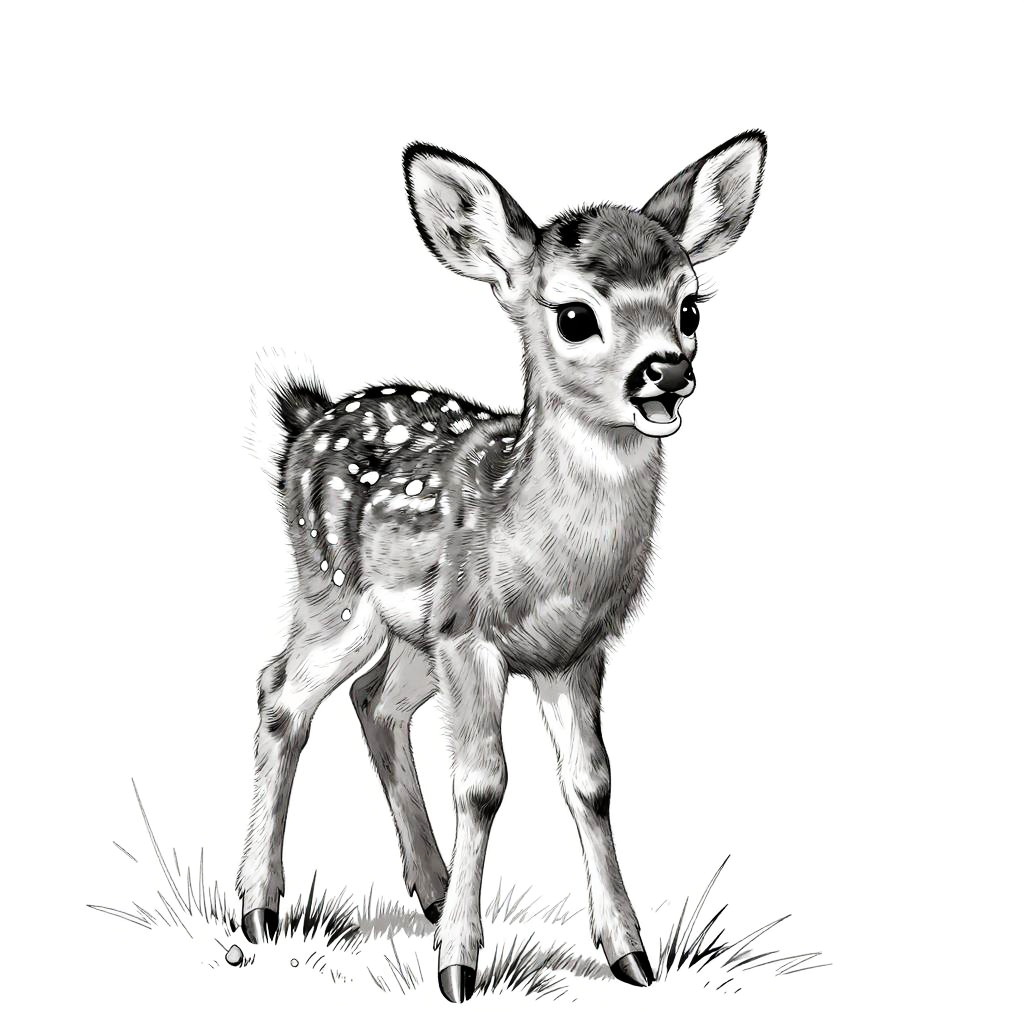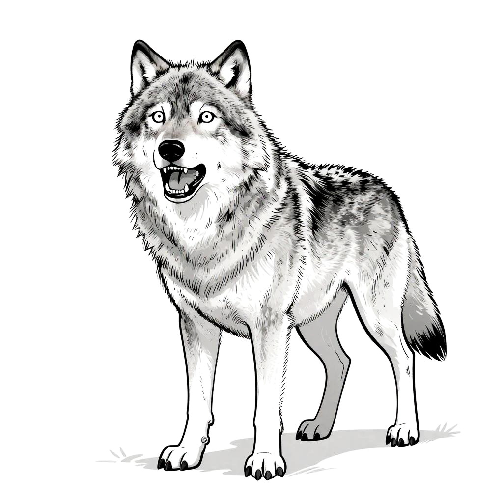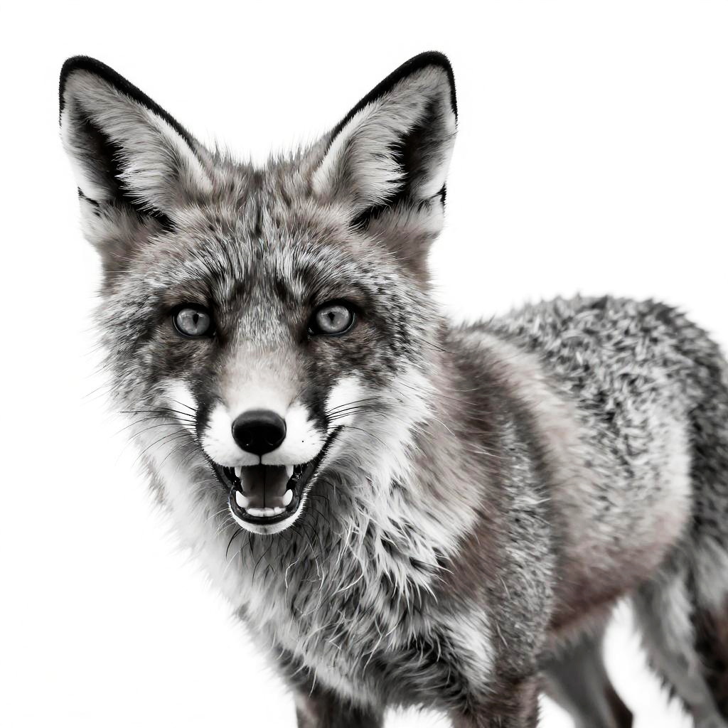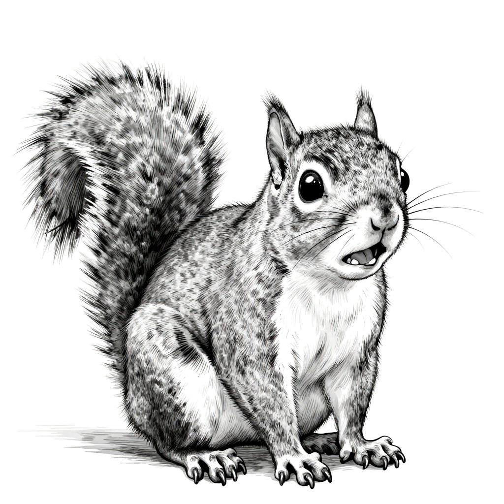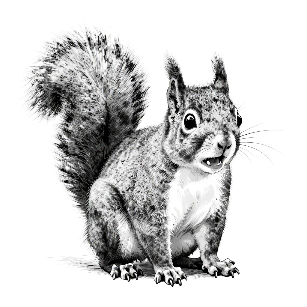 Black and white line art of a cautious white ferret with fur raised, back arched, mouth open, and wide eyes, capturing a sense of fear and tension.