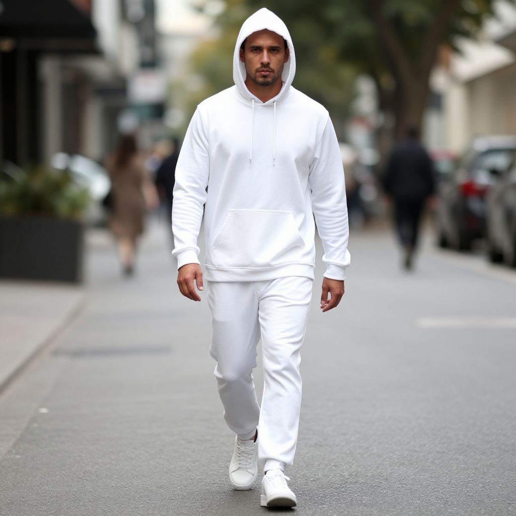 "White Rave Clothes Costume, man in white shirt and hoodie walking down street"