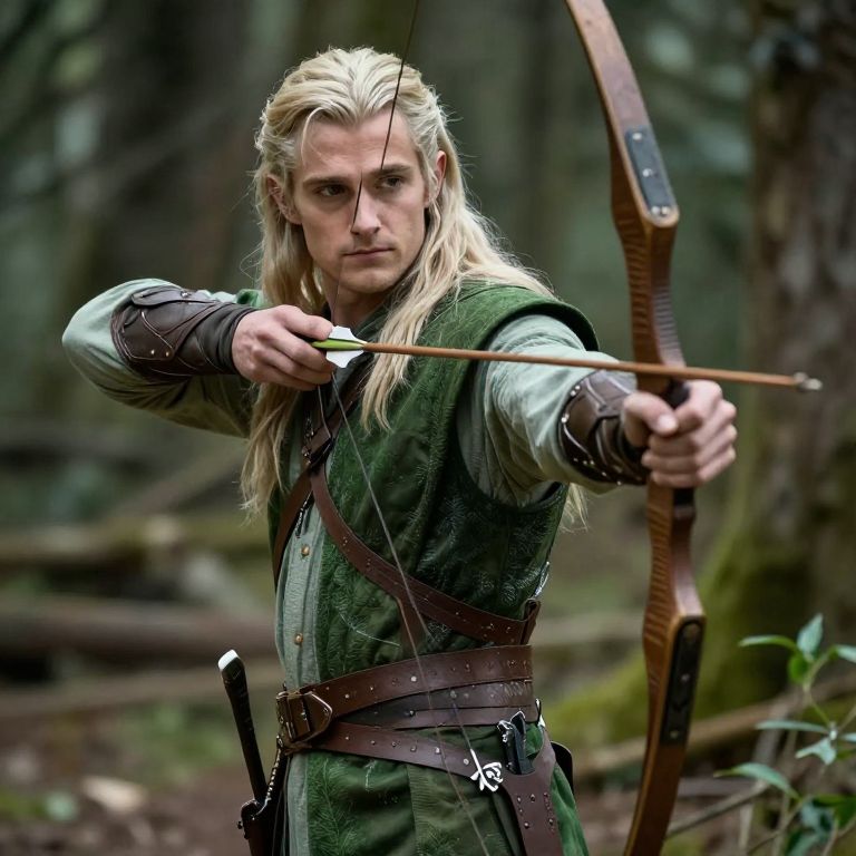 Photograph of a blonde, fair-skinned male archer with long hair, wearing a green medieval tunic and brown leather belts, drawing a bow