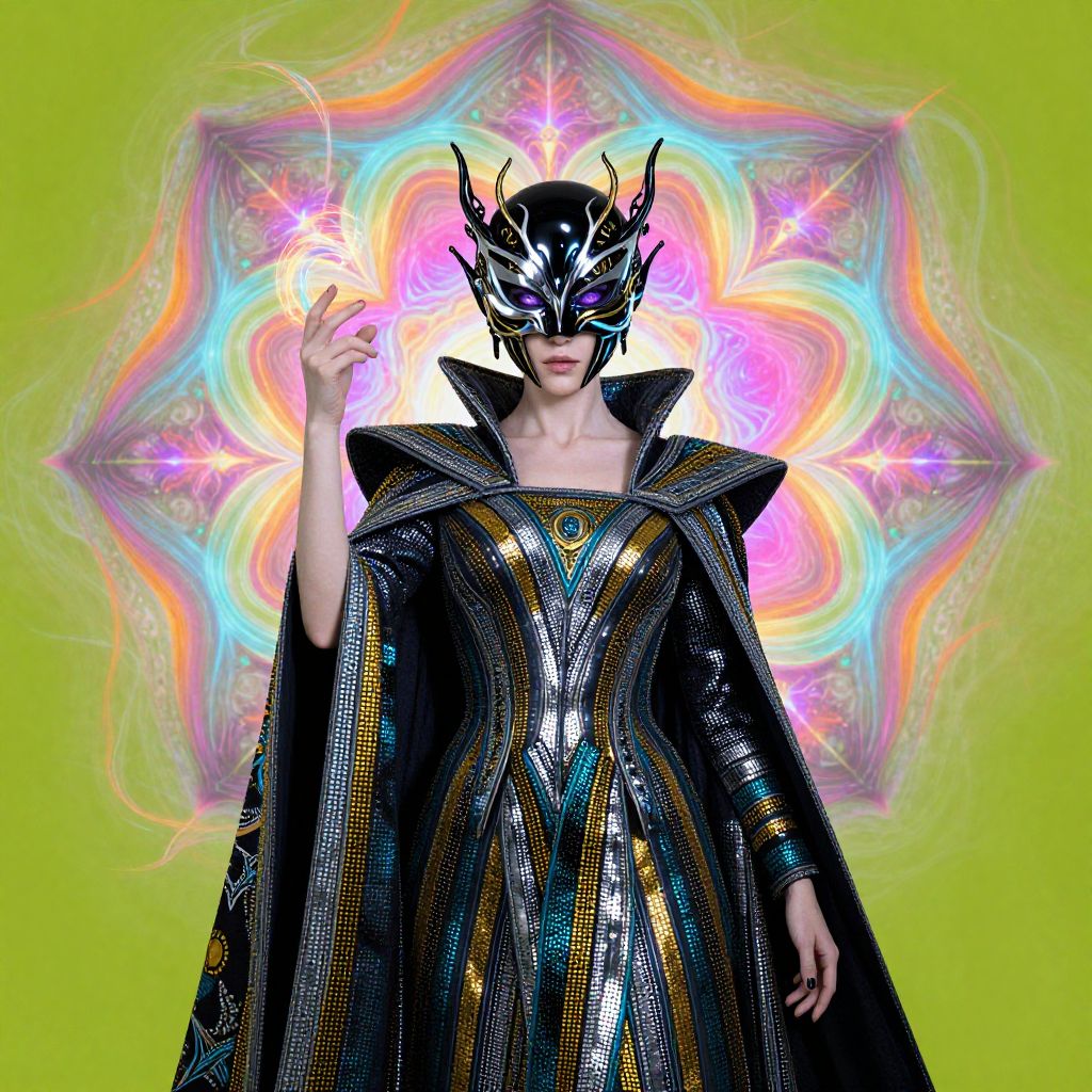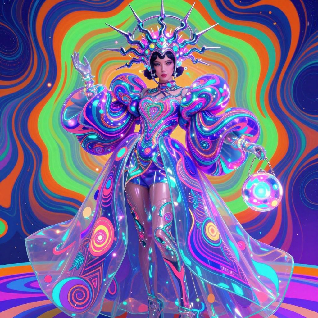 A hyper-realistic anime-style portrait of a woman in avant-garde oversized clothing, rendered in the style of *Anime Niji*, with influences from *velvetmyst* and *psypop*, She wears an exaggerated, voluminous outfit that swallows her frame in surreal fashion, featuring oversized sleeves and a floor-length, flowing skirt made from translucent, iridescent fabric that shifts between neon purple, turquoise, and pink, The fabric is decorated with intricate psychedelic patterns, glowing softly with abstract shapes and pulsing with electric energy, Her headpiece is an immense, surreal crown that hovers above her, its twisting, metallic spikes extending outward in every direction, almost like an otherworldly halo, Accessories include a large, glowing orb handbag that levitates by her side, and long, translucent gloves that shimmer with light, The background is a 70s psychedelic-style poster, filled with swirling abstract patterns and vibrant hues of neon green, orange, and deep blue, The entire scene radiates energy and surrealism, reminiscent of *psychedelic style posters*, with bright, bold colors and a dynamic, otherworldly atmosphere, Cyberpunk, illustration, 70s psychedelic style poster, vibrant colors, bright colors