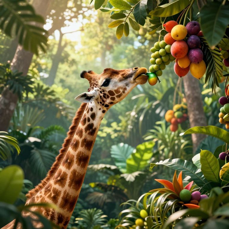 Giraffe giraffe fruit in a vibrant jungle setting, sunlight filtering through dense leaves, the giraffe reaching tall branches to munch on colorful tropical fruits, cinematic style