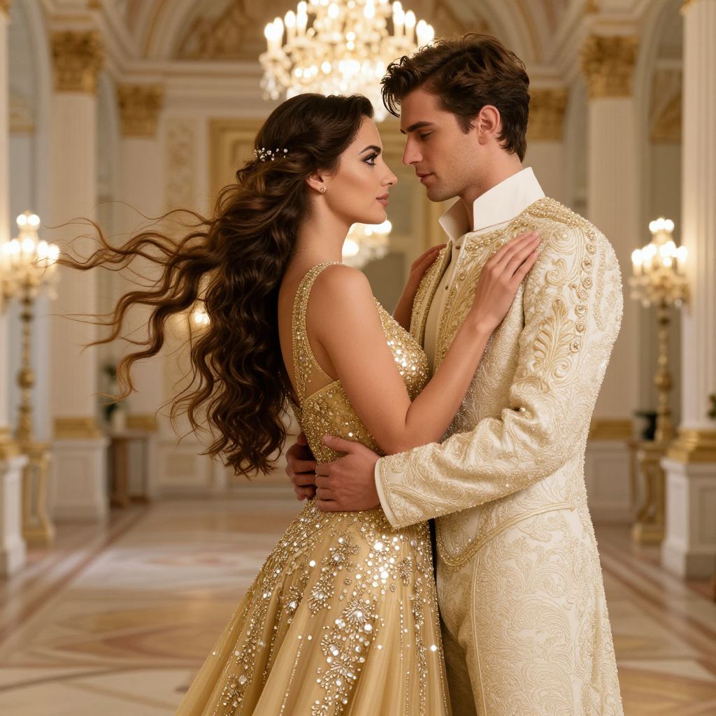 A beautiful woman with long, flowing hair in a luxurious golden dress with sparkling crystals embraces a handsome young man in a palace hall.