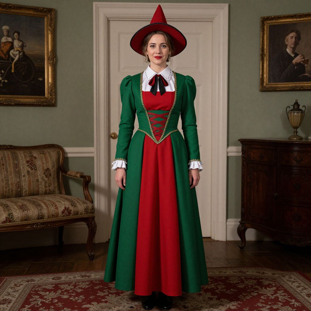 Irish Wench Costume, woman in a green and red dress and hat standing in a room