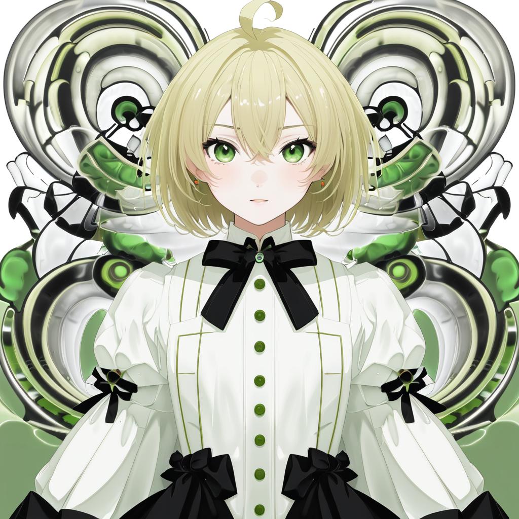 Digital anime-style portrait of a young girl with medium-length blonde hair and bright green eyes. She wears a white long-sleeve shirt with ruffles and a black ribbon bow. The background is abstract with green and white vibrant patterns. The character has a hair ribbon and delicate features, inspired by the anime style.