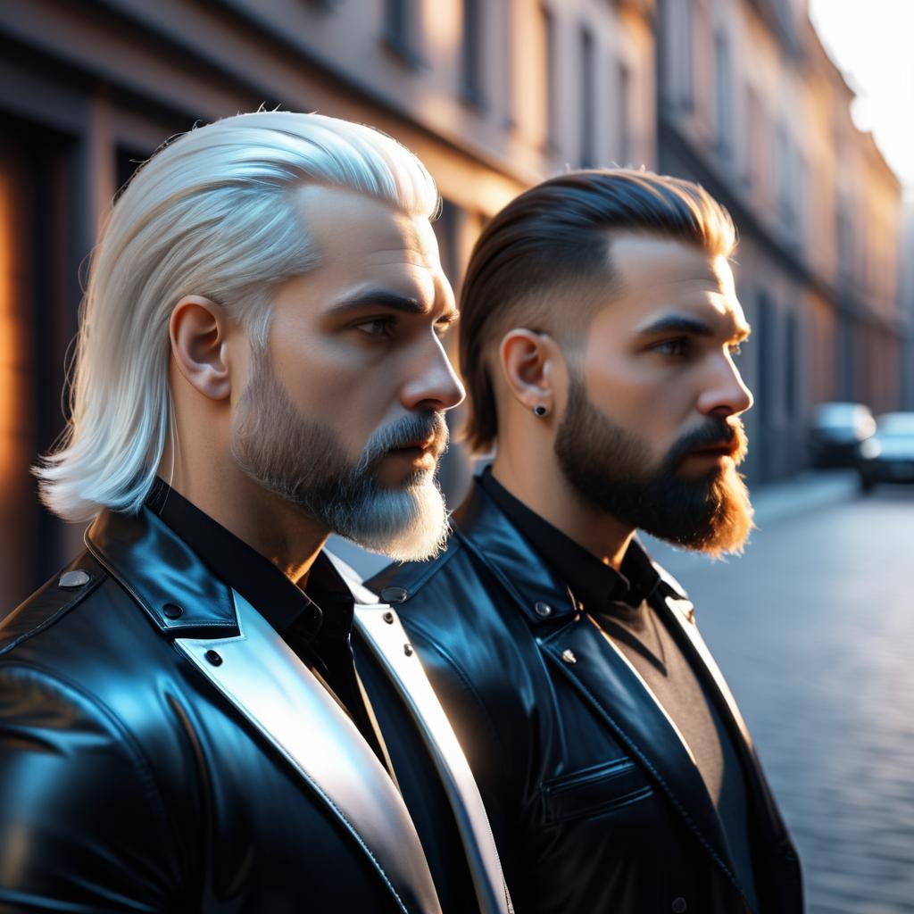 Extreme long shot. 35 years old blonde russian man in white adidas pants. black letaher jacket. white sneakers. hangover face. staying on the street. 4k, 8k, hyprerealistic, extreme hight detail, trending on artstation, masterpiece