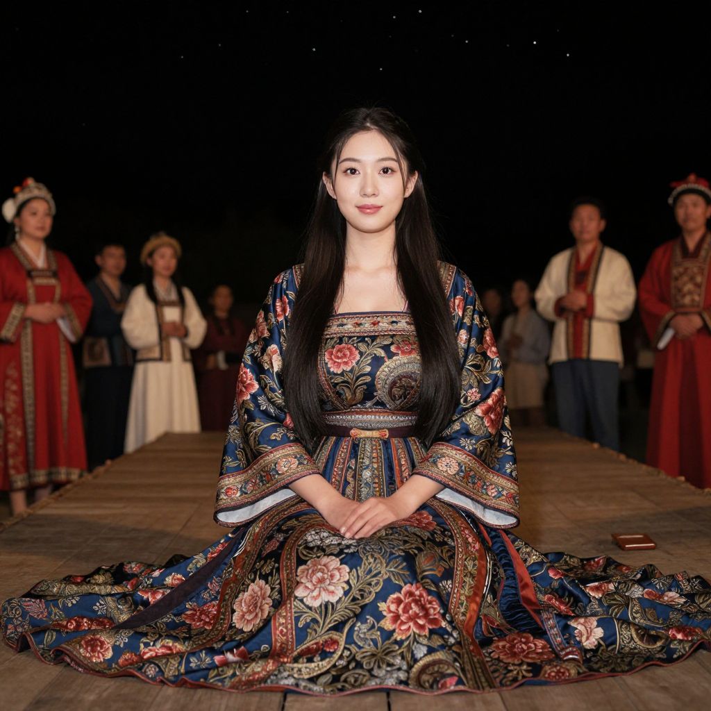 A beautiful traditional costume party dress made of rich brocade with floral pattern, worn by an elegant woman with long black hair and a serene facial expression, sitting on a wooden platform at a cultural celebration under a starry night sky. The woman has big tits and cute face