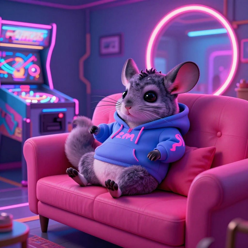 A digital CGI image features a cute, anthropomorphic grey and white chinchilla with large, dark eyes, wearing a blue hoodie with pink stripes and the word "Funk" on it. The chinchilla sits on a pink, tufted couch in a neon-lit arcade room. Behind it, an arcade game with colorful lights is visible, and a large, glowing neon ring adorns the wall. The room has a retro, cyberpunk aesthetic with purple and pink neon lights. The chinchilla's fur is detailed and fluffy, contrasting with the smooth texture of the couch and the vibrant, futuristic background.