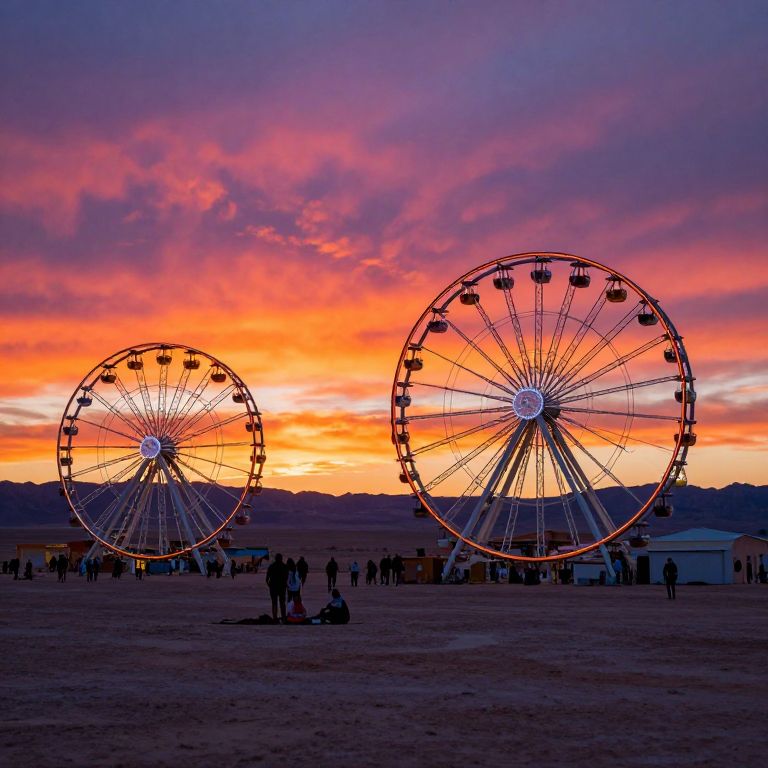 Photograph of a vibrant sunset at a fairground, featuring two large, illuminated Ferris wheels with red and white lights. The sky is a stunning gradient of orange, pink, and purple hues. Silhouetted people are scattered around the sandy ground, some standing, others sitting or walking. The Ferris wheels are positioned on the right and left sides of the image, with a distant mountain range under the colorful sky. The scene captures the contrast between the bright sunset and the darkened Ferris wheels and people.