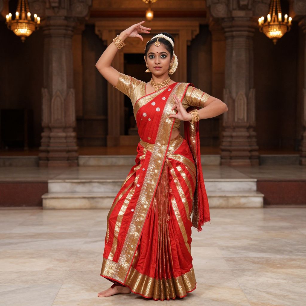 A young woman with deep green eyes and fair skin, wearing a bold red and gold saree dance costume with intricate silver zari work, performing traditional Bharatanatyam movements on a polished marble stage illuminated by candlelight and traditional chandeliers in a historic temple complex.. The woman has big tits and cute face