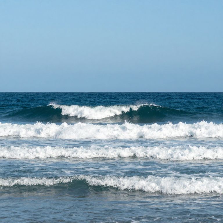 Photograph of a serene ocean scene. The image captures deep blue waves cresting and breaking with white frothy foam in the foreground. The middle of the photo shows smaller waves, while the background features a calm, expansive horizon where the dark blue sea meets a clear, pale blue sky. The sunlight creates a bright, contrasting effect on the water, highlighting the textures of the waves and foam. The overall mood is peaceful and refreshing, evoking a sense of calm and natural beauty.